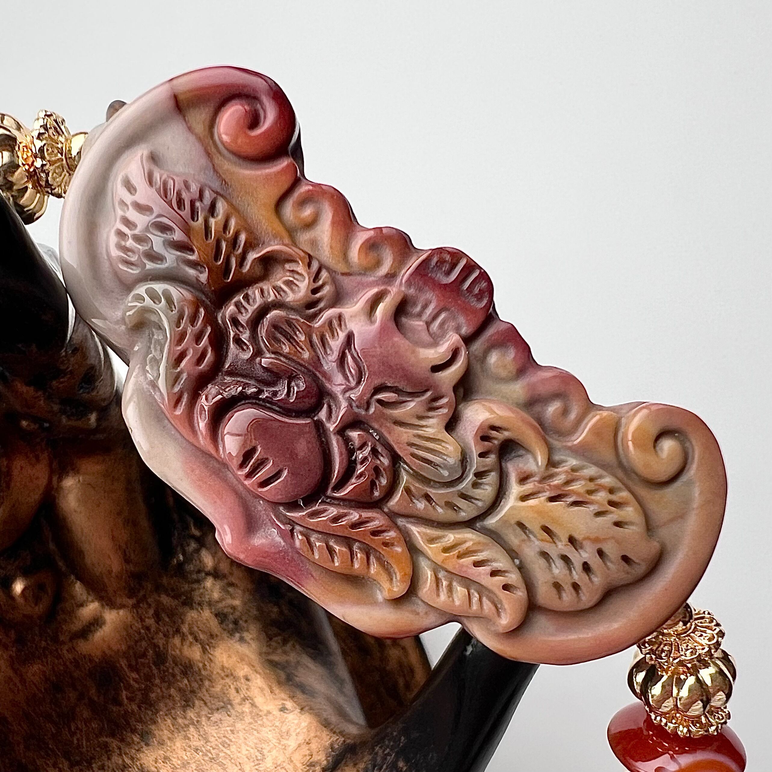 メインのアラシャン瑪瑙には如意の中に九尾の狐の彫刻が施されています