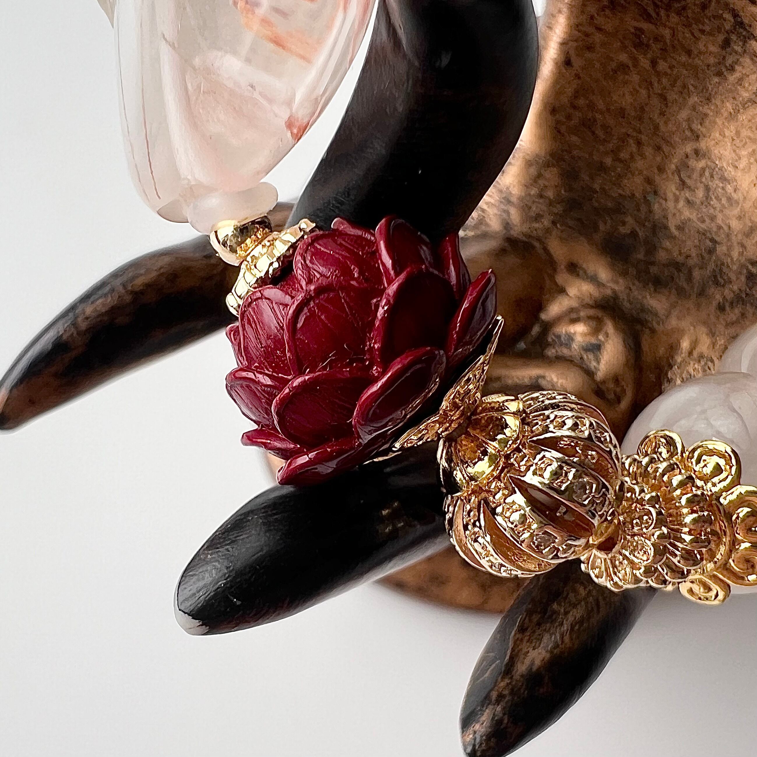 アクセントとして水晶の赤いインクルージョンに合わせた、練りシナバーの真っ赤な蓮花もあしらいました