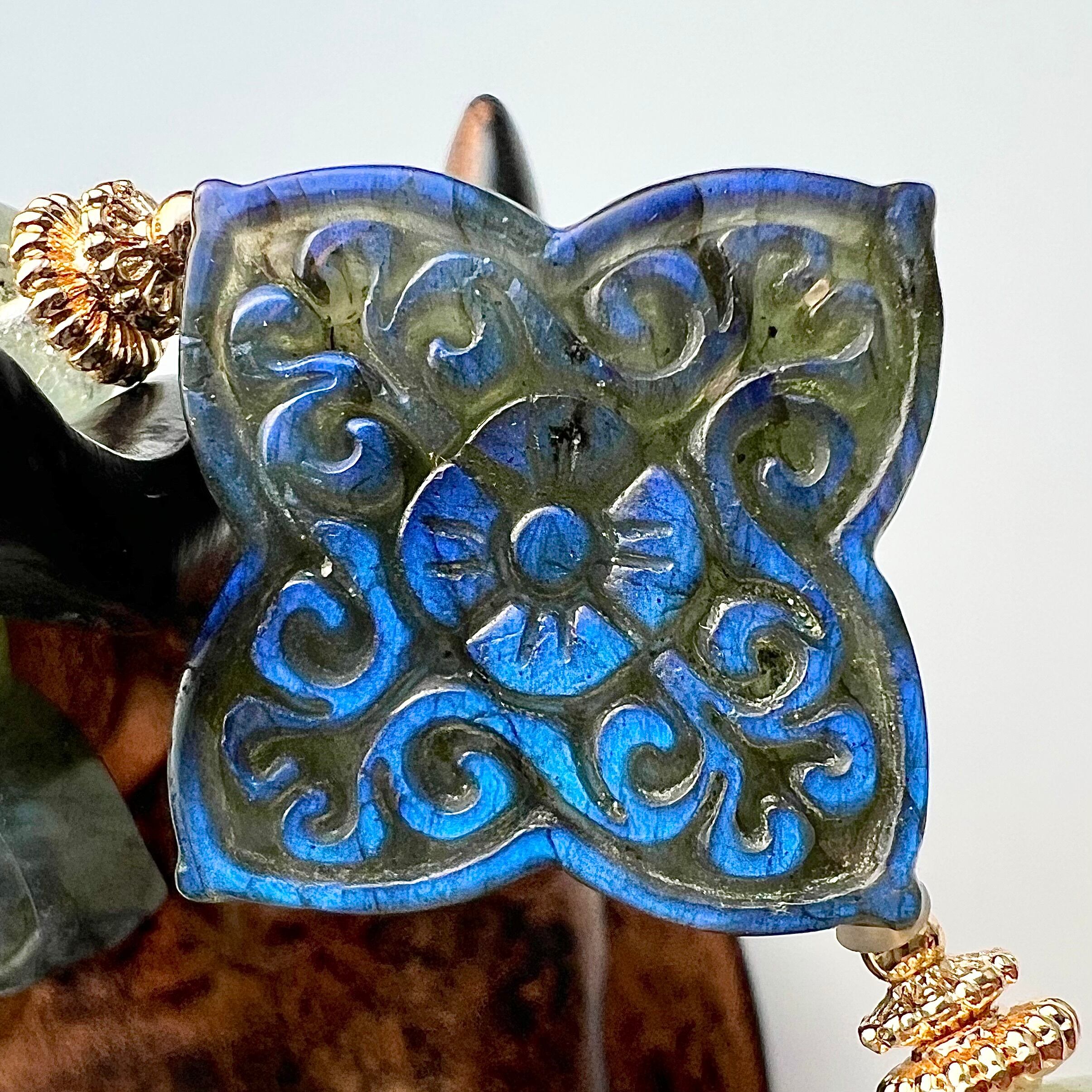 花彫りが施された4つのラブラドライトには、いずれも綺麗なブルーシラーがあらわれます