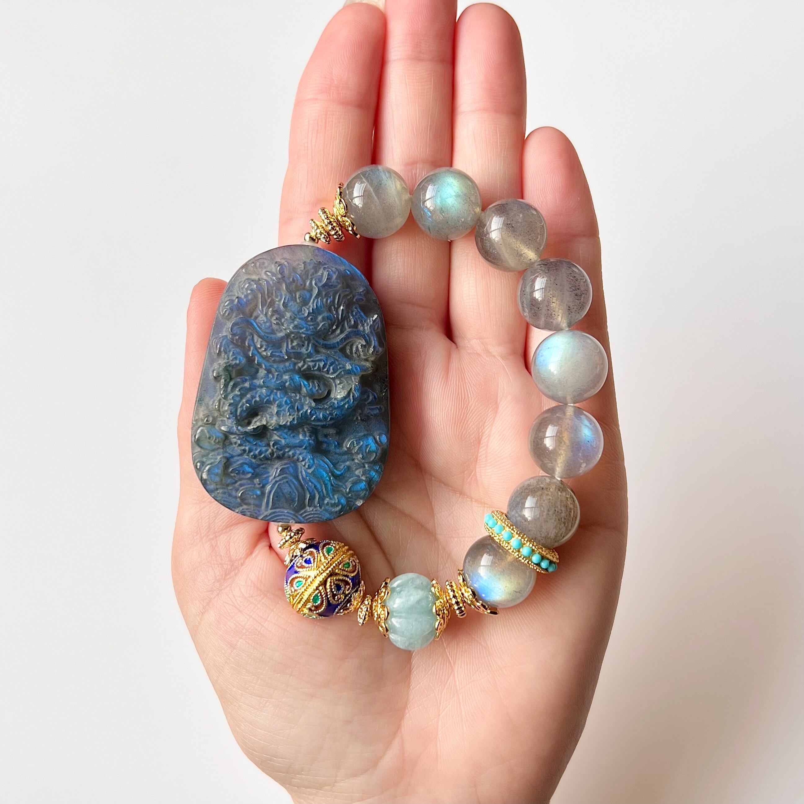アジア圏の装飾をイメージした、大きなラブラドライトの龍彫りがメインのデザインブレスレットです
