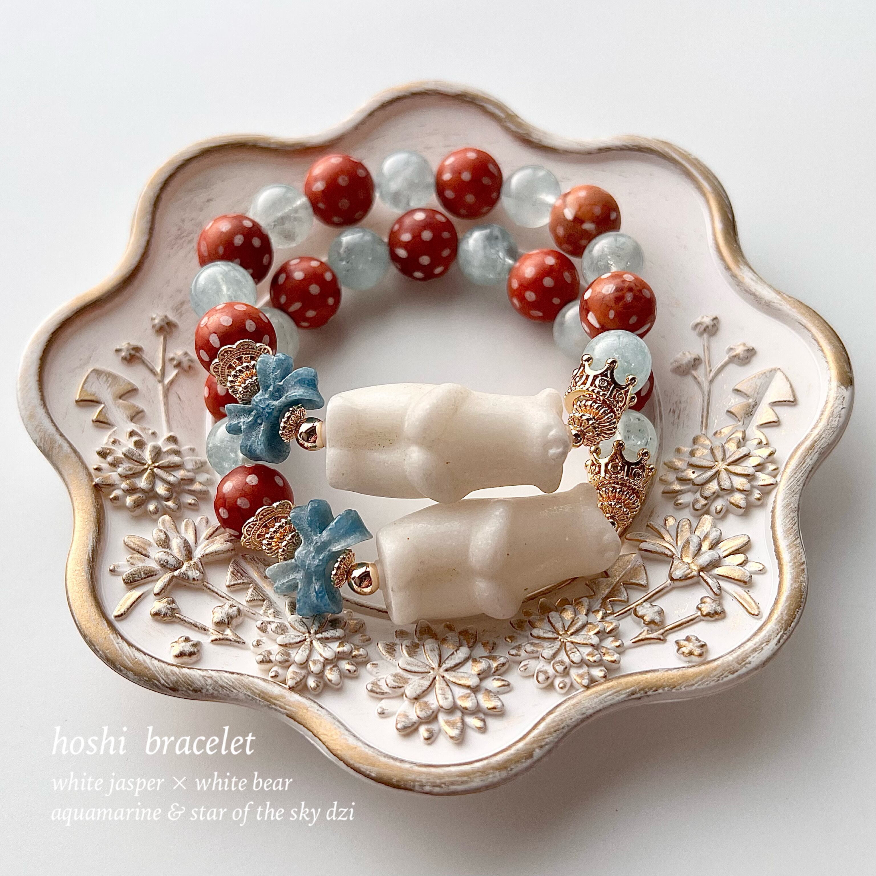 ホワイトジャスパーの白くまとアクアマリン、満天天珠のデザインブレスレットです