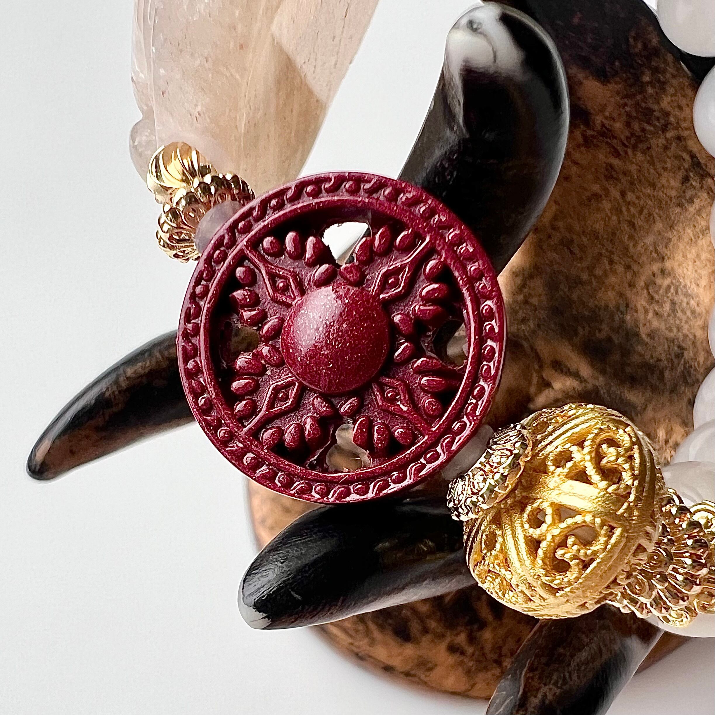 ムーンストーンの白を基調に、赤いシナバーとゴールドパーツが映える一本です