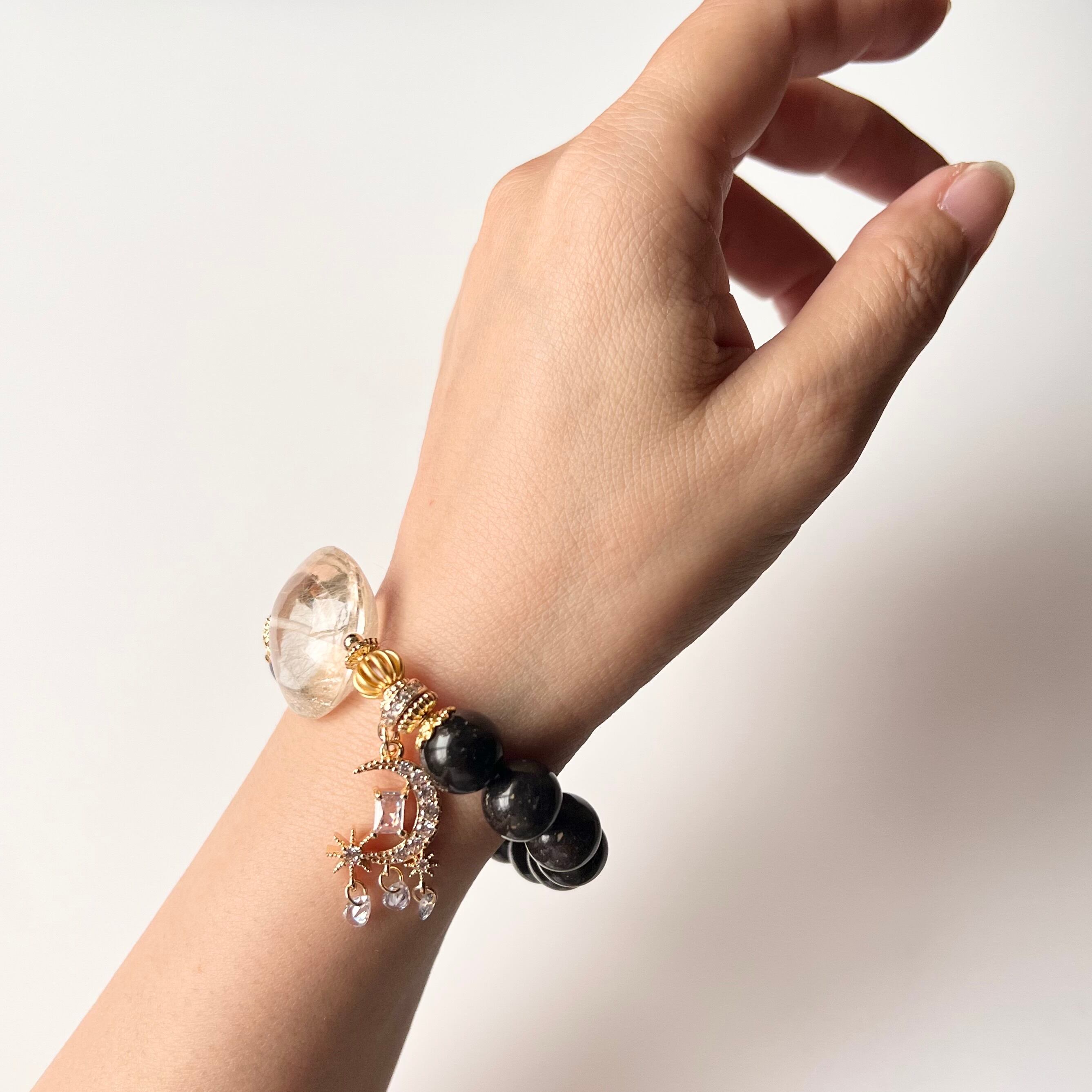 ゴールドルチルクォーツとブラックオパールのデザインブレスレットです