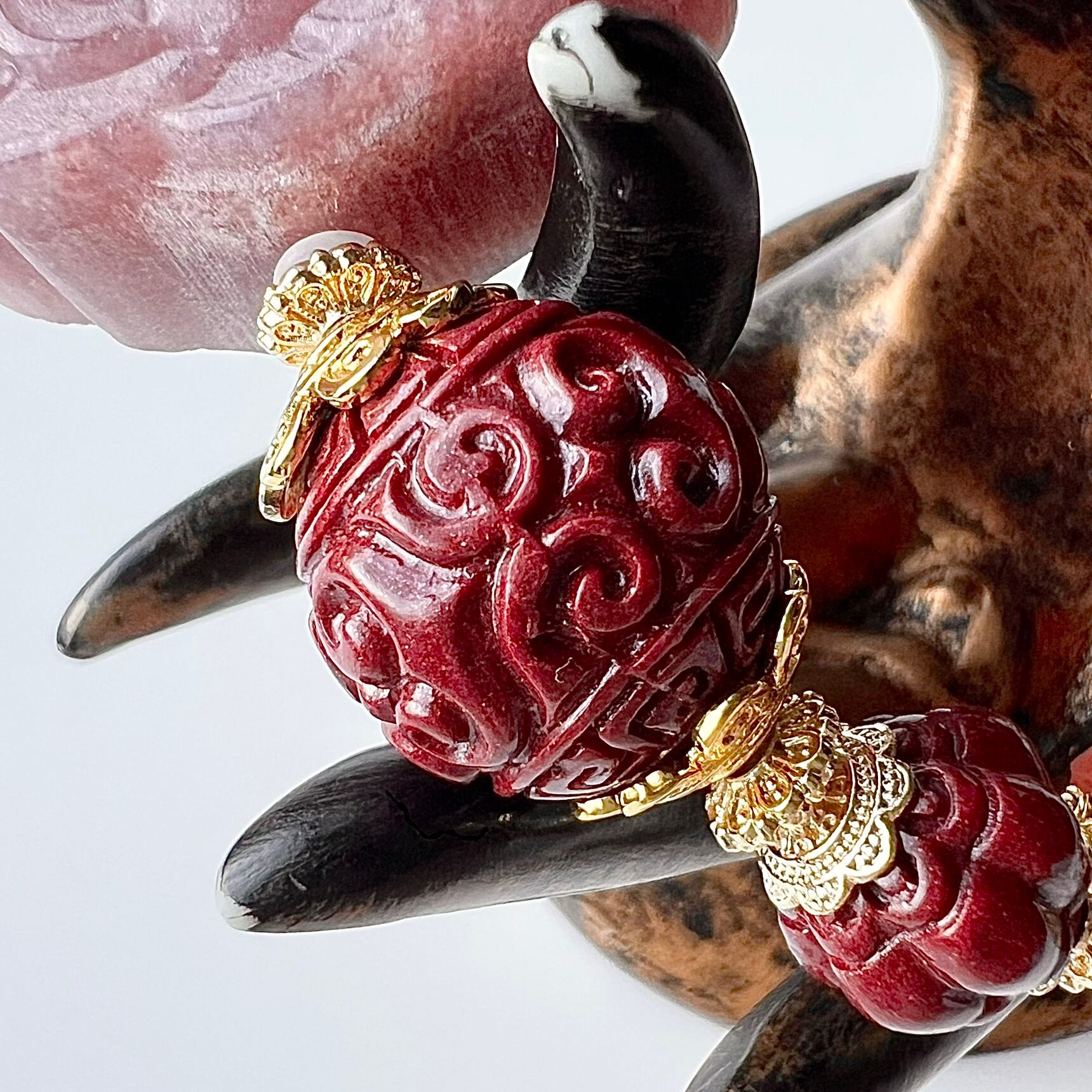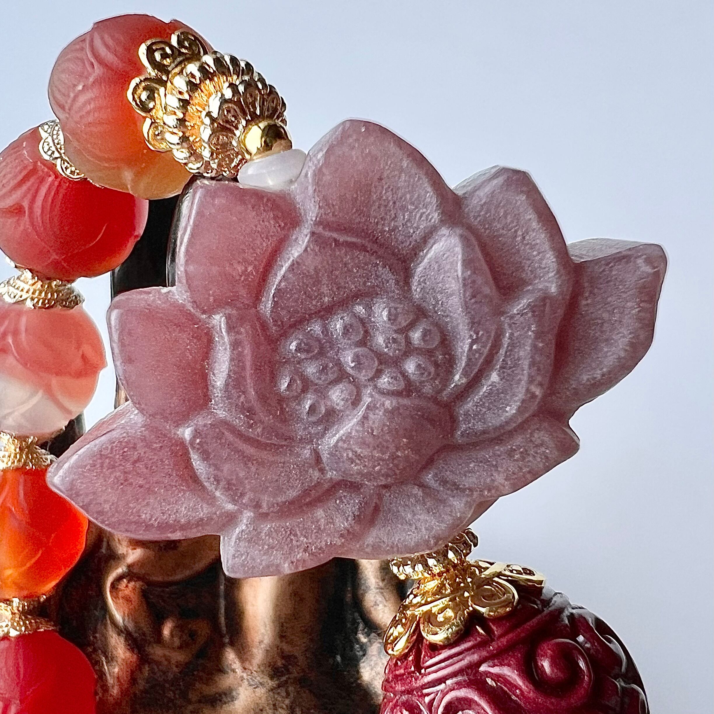 ストロベリークォーツと瑪瑙の蓮花彫刻と、シナバーの回紋珠デザインブレスレットです