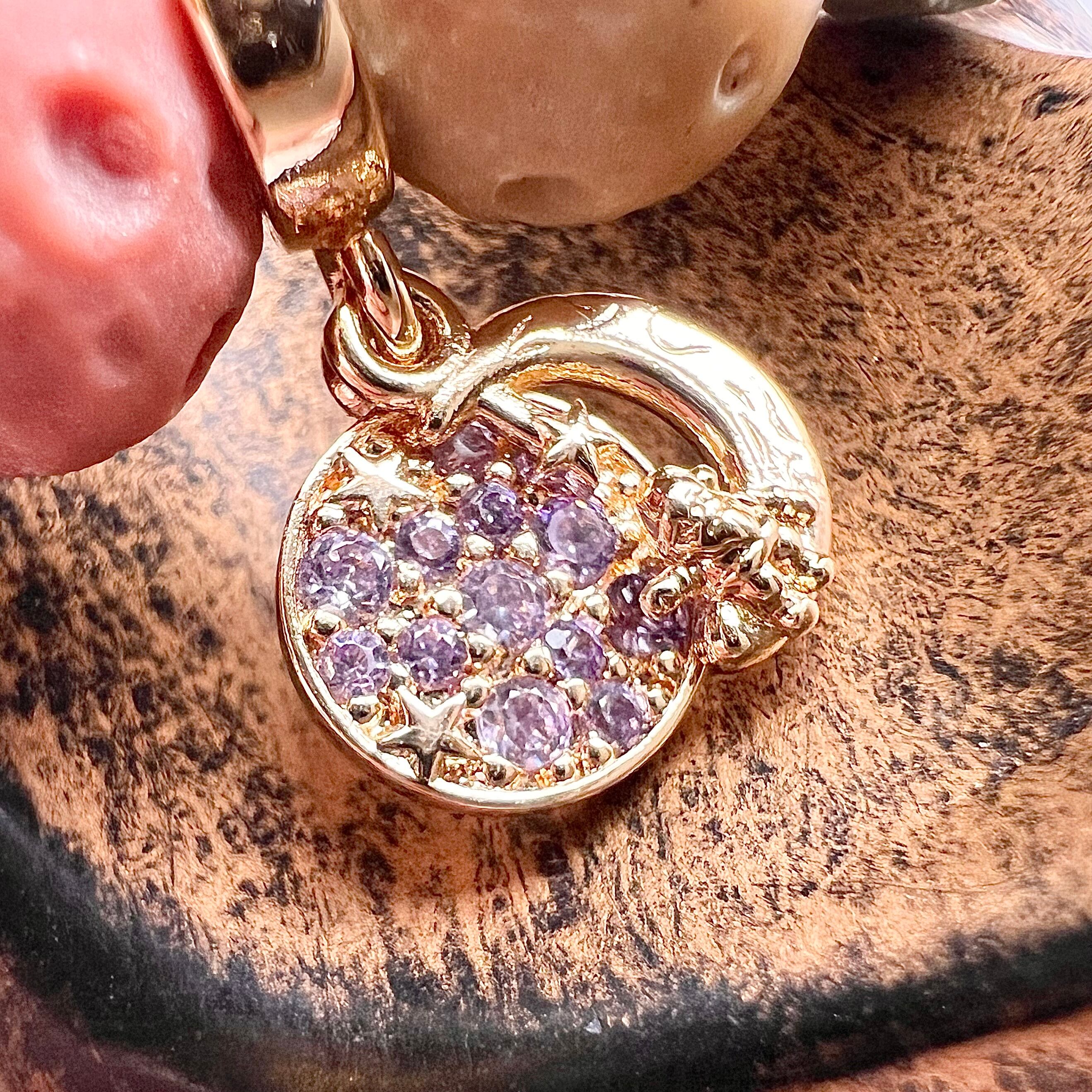 他にもムーンストーンを惑星のリングに見立てたゴールドパーツにくぐらせたり、十字星が彫られた小さなラピスラズリをアクセントにあしらいました