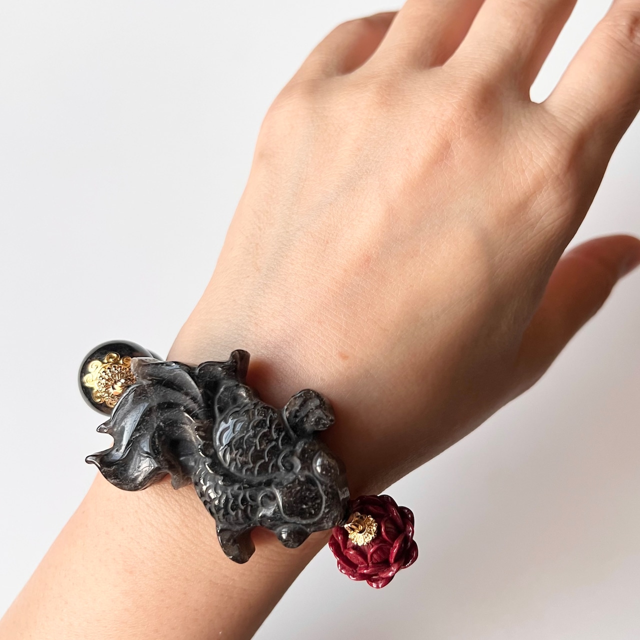 モリオンの金魚とブラックフォッシルコーラルのデザインブレスレットです