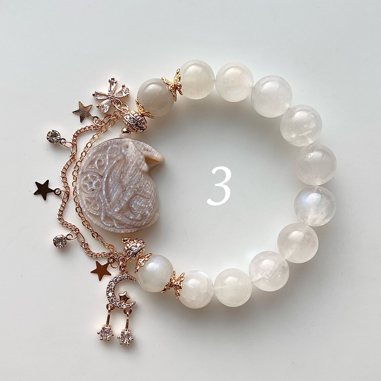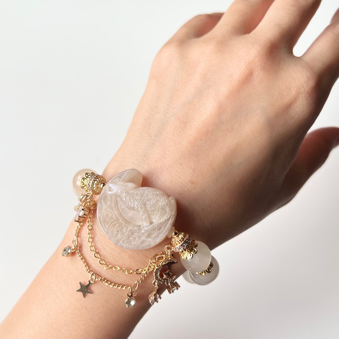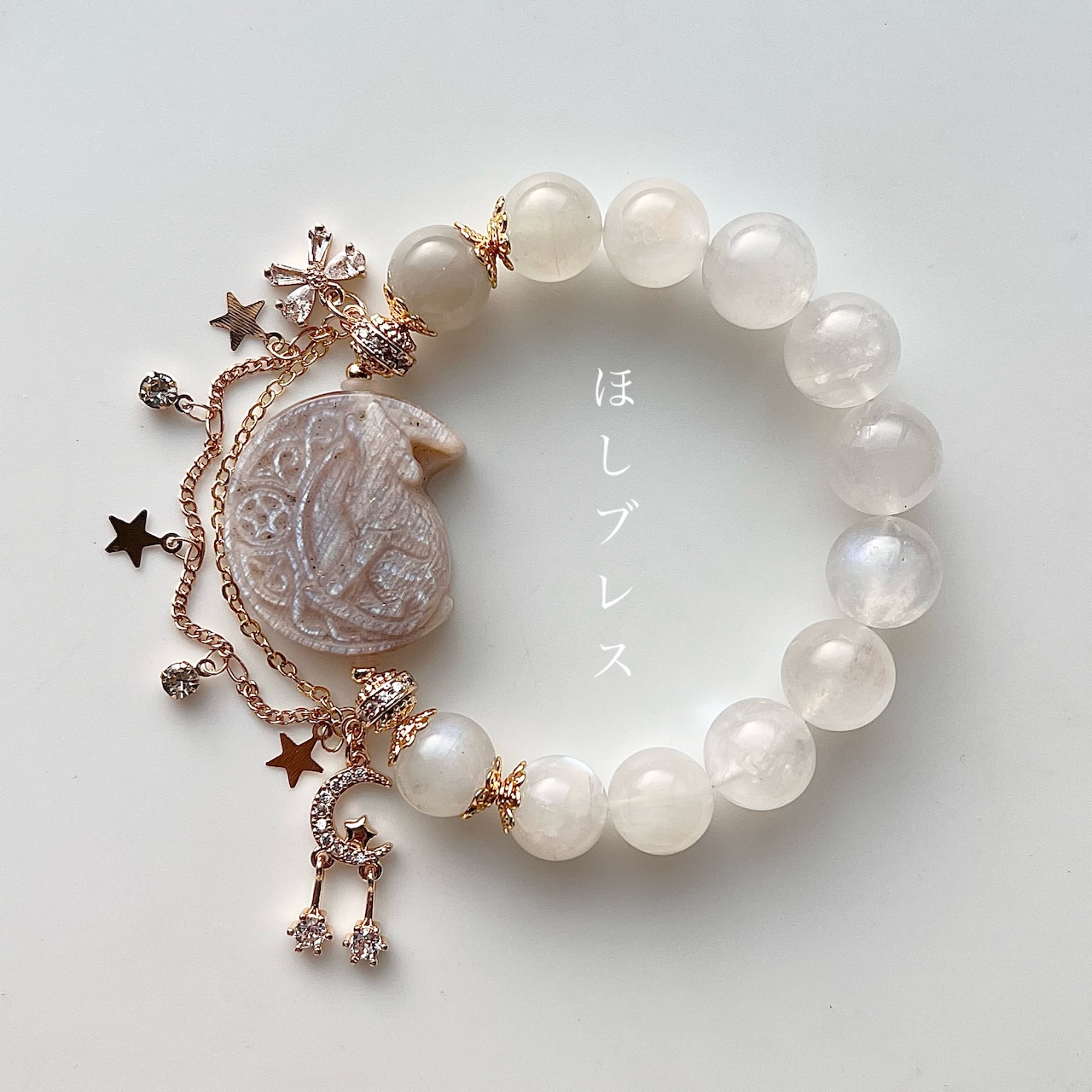 三日月とオオカミの彫刻が施されたムーンストーンデザインブレスレットです