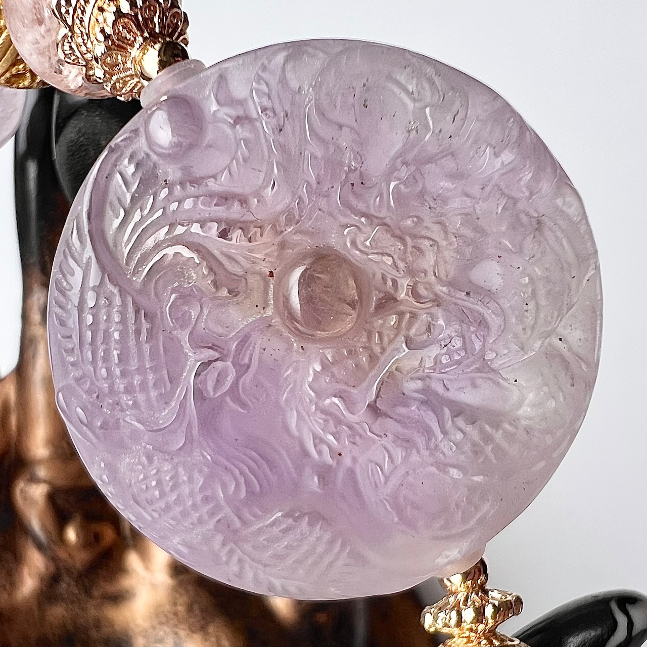 龍と鳳凰の彫刻が施されたアメトリンとスコロライトのデザインブレスレットです