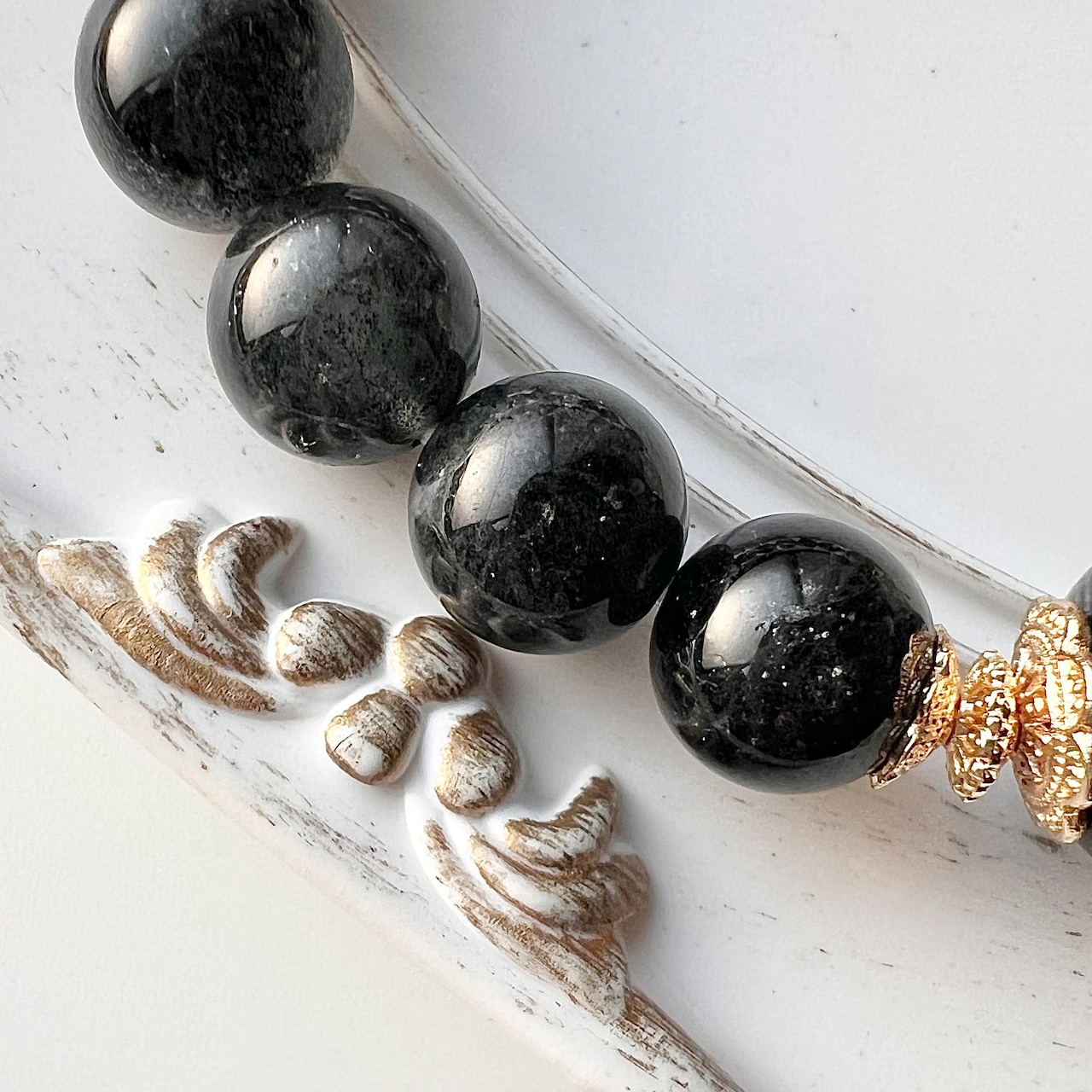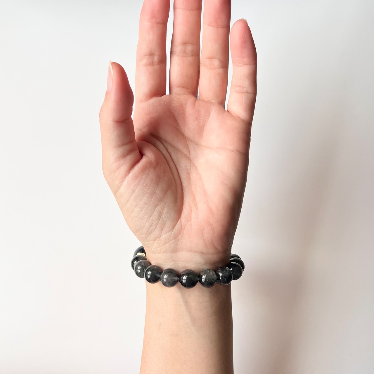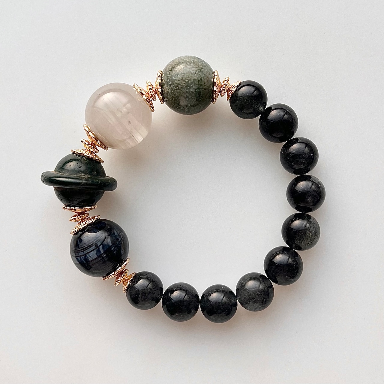 惑星に見立てた4種の大玉とブラックストロベリークォーツのデザインブレスレットです