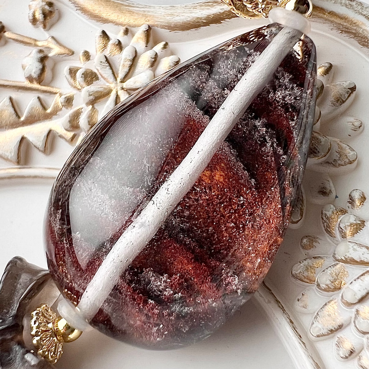 他にも王冠のゴールドパーツやスモーキークォーツのリボンをあしらい華やかに仕上げました