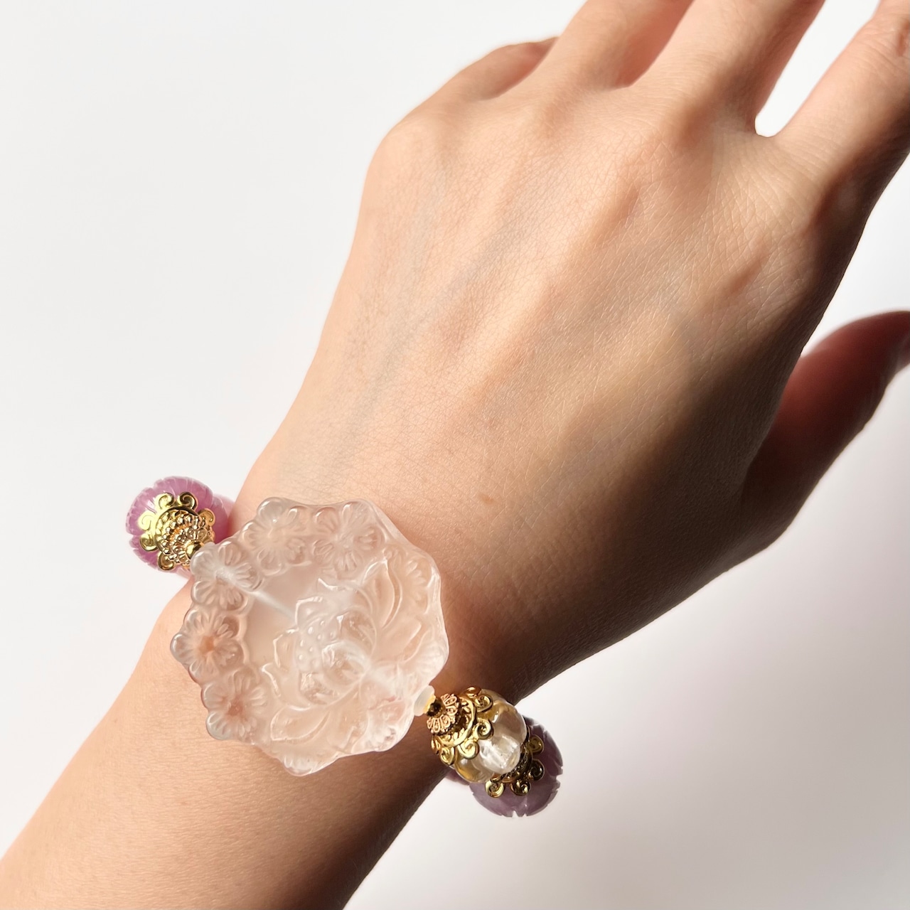 蓮の花の彫刻が施された水晶とクンツァイトのデザインブレスレットです