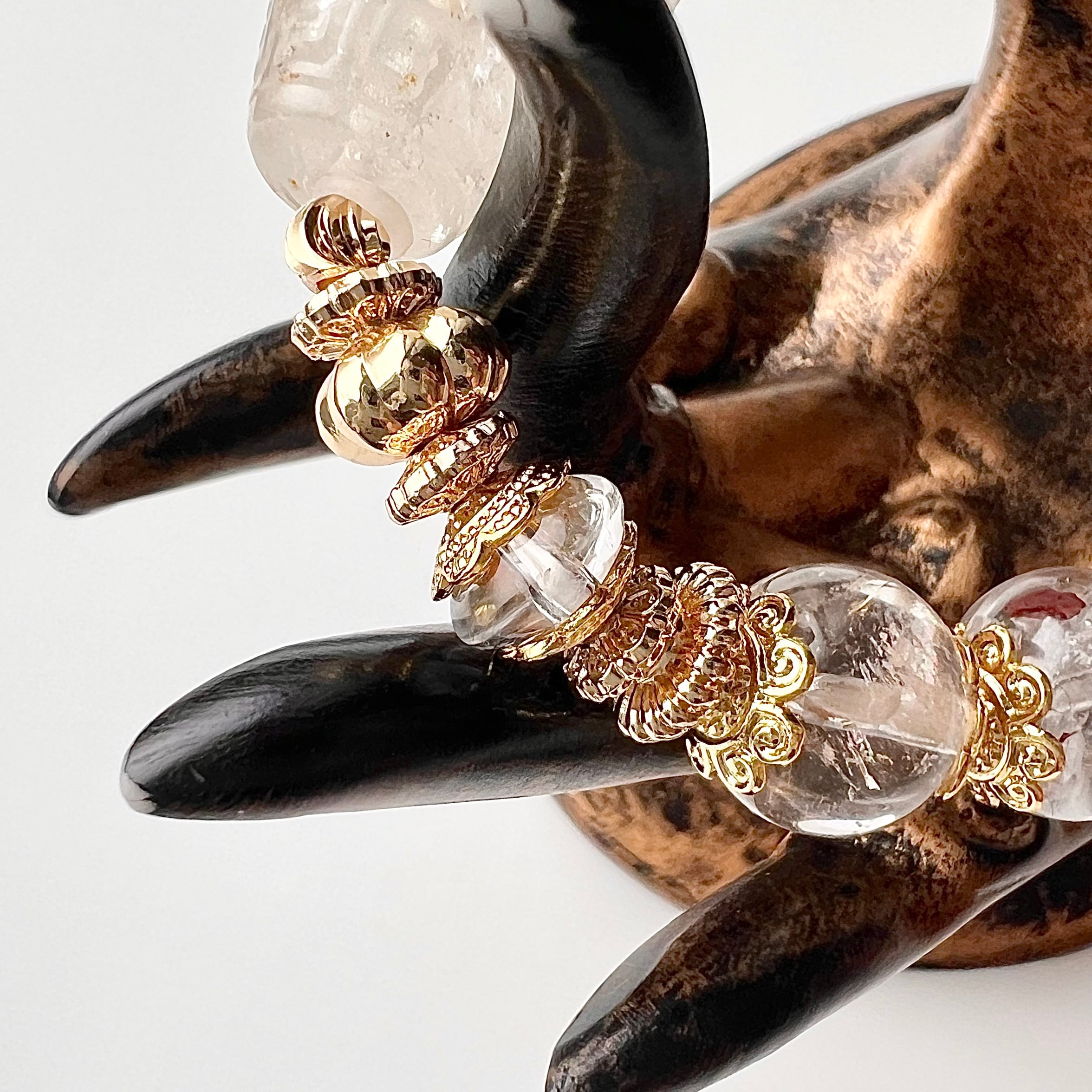 アジア圏の装飾をイメージした、水晶にゴールドパーツが映えるブレスが出来ました