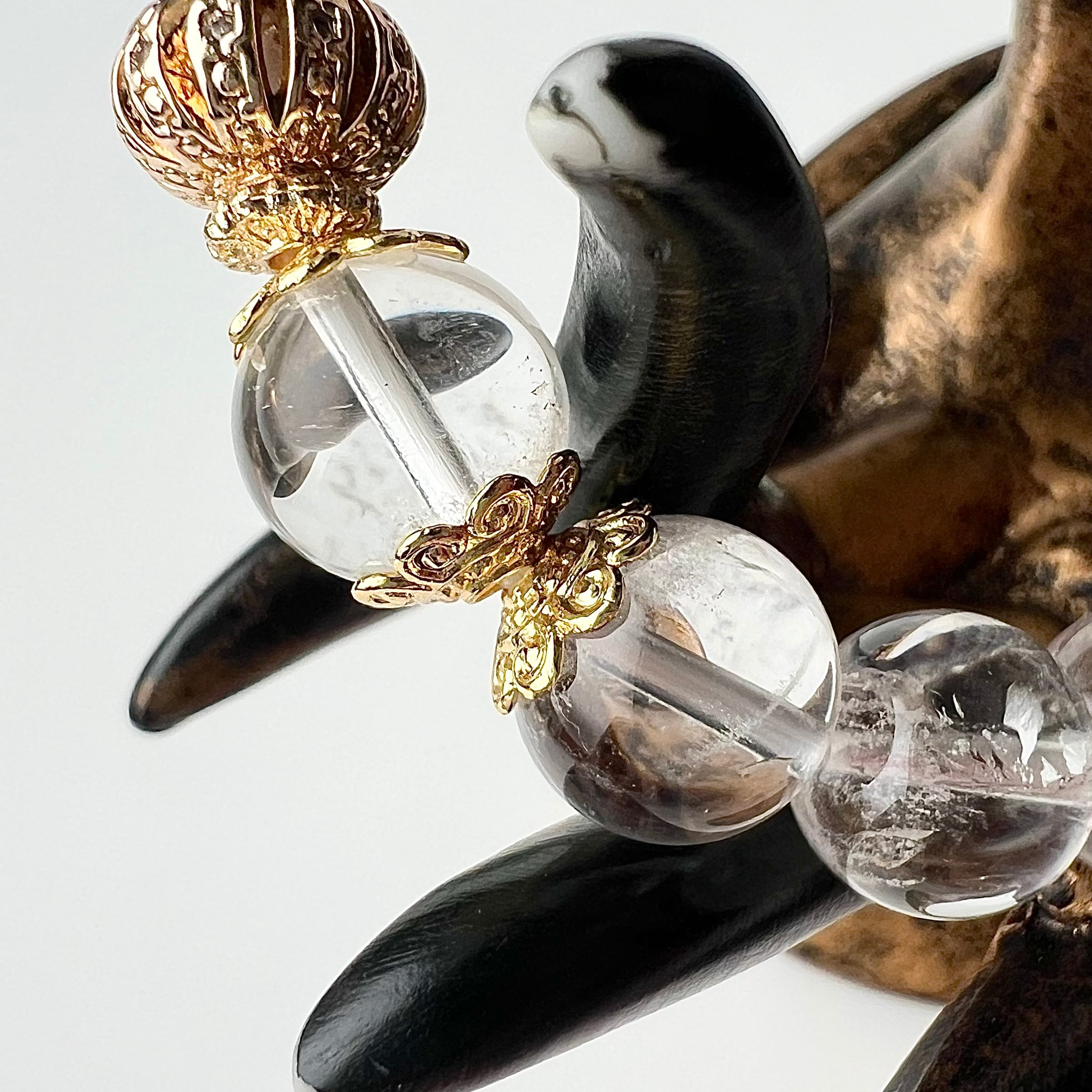 アジア圏の装飾をイメージした、水晶にゴールドパーツが映えるブレスが出来ました