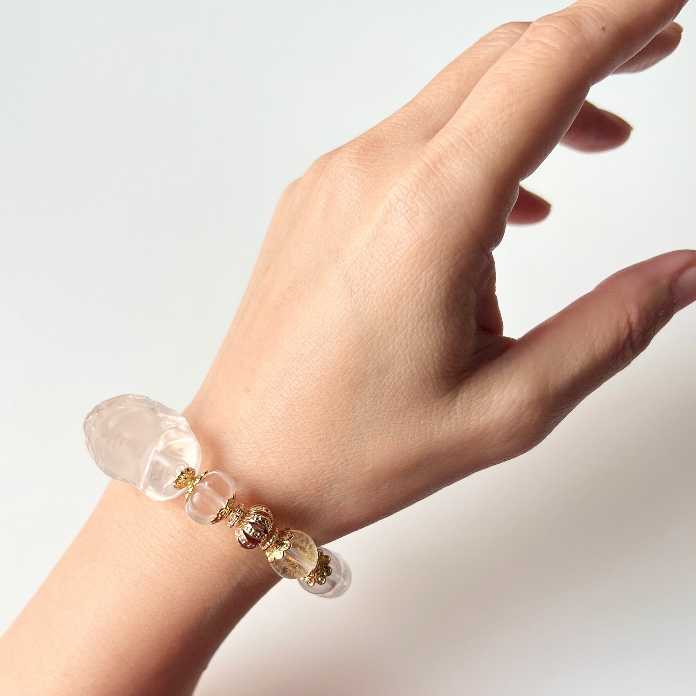 水晶の観音菩薩彫刻と、ヒマラヤ水晶のデザインブレスレットです