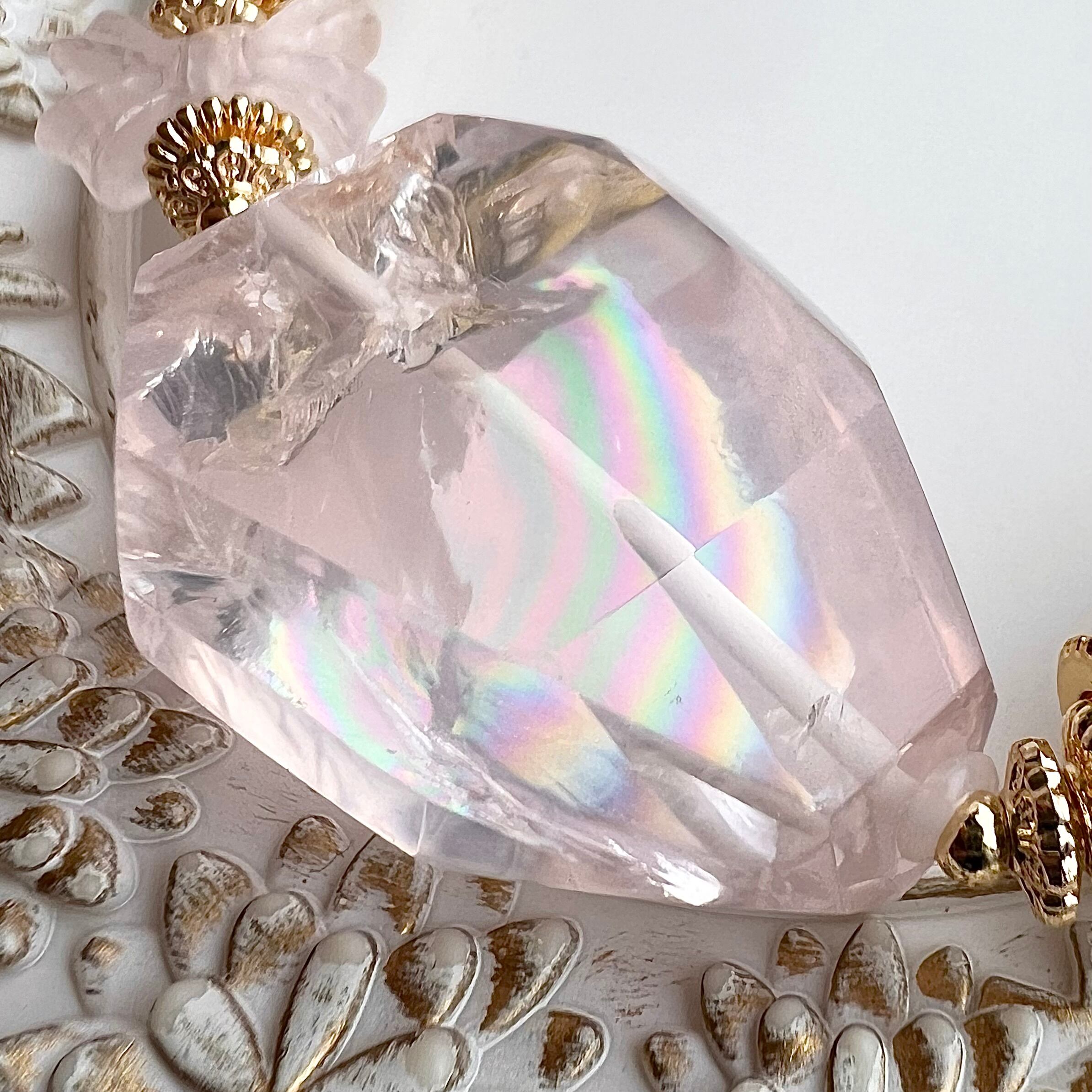 メインのラフカットされたローズクォーツには大きめの虹があらわれます