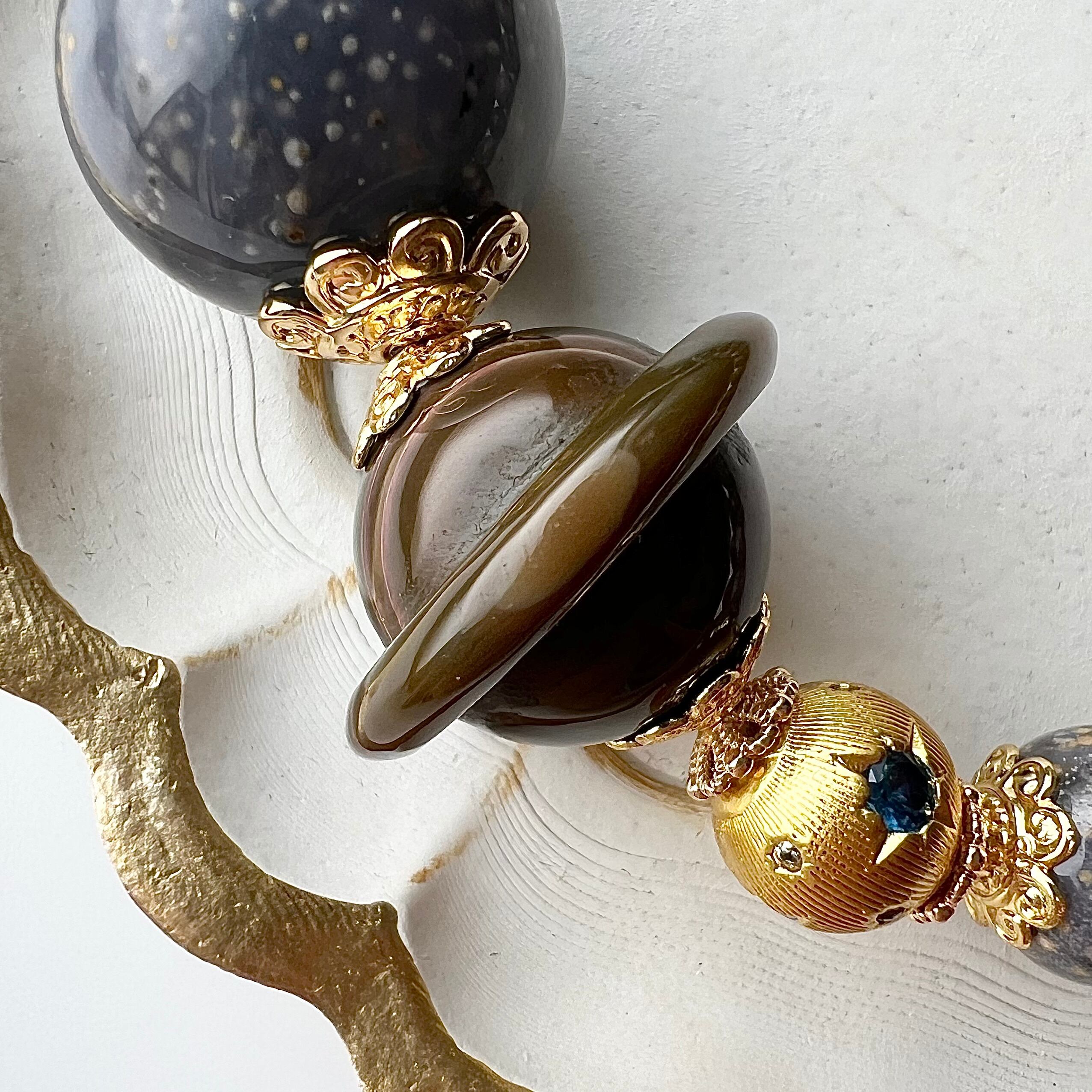 そんな星空瑪瑙の周りを漂うように、アラシャン瑪瑙の惑星彫刻を大小2個あしらいました