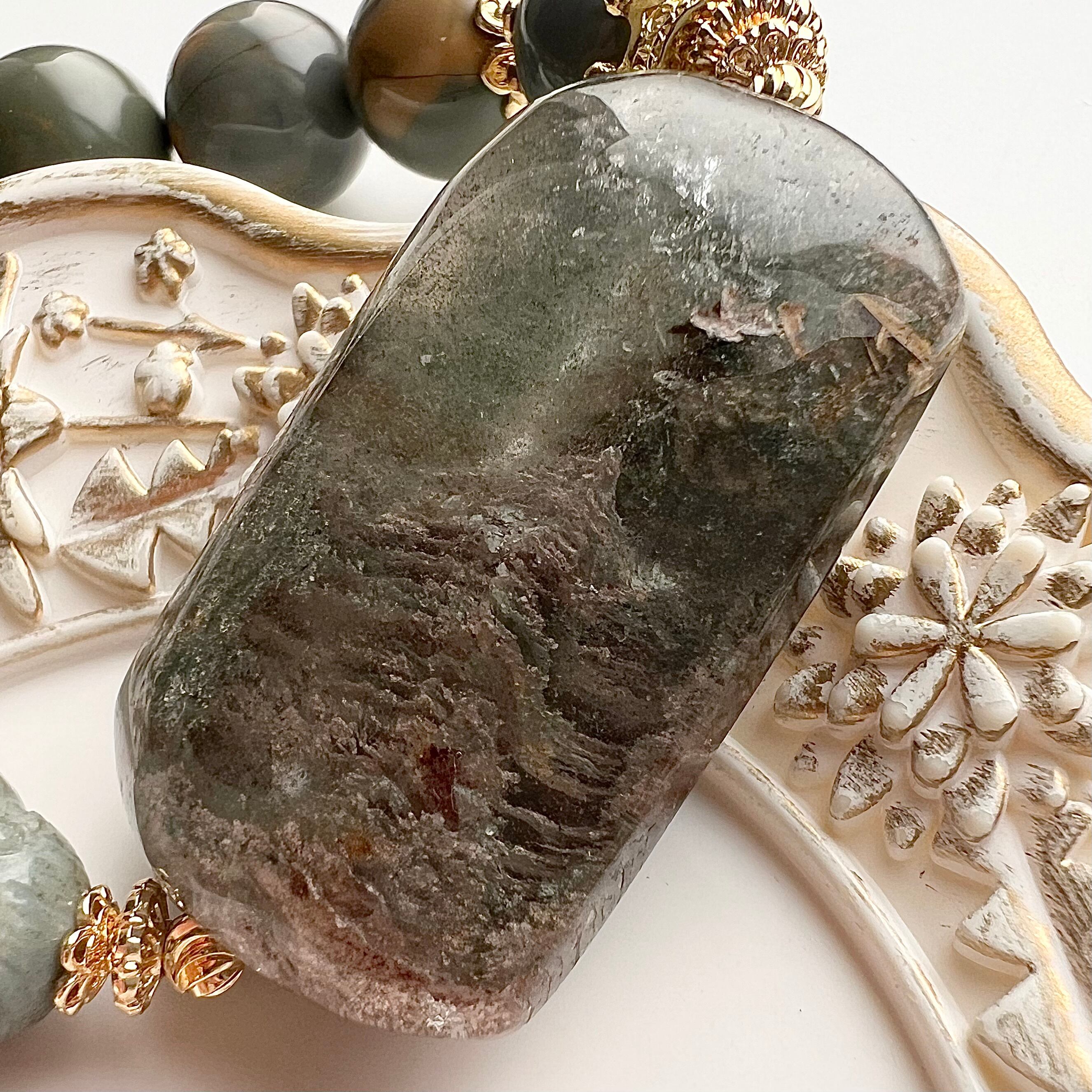 ブレス部分はガーデンクォーツの色に合わせて、くすみグリーンの大玉アラシャン瑪瑙を使用