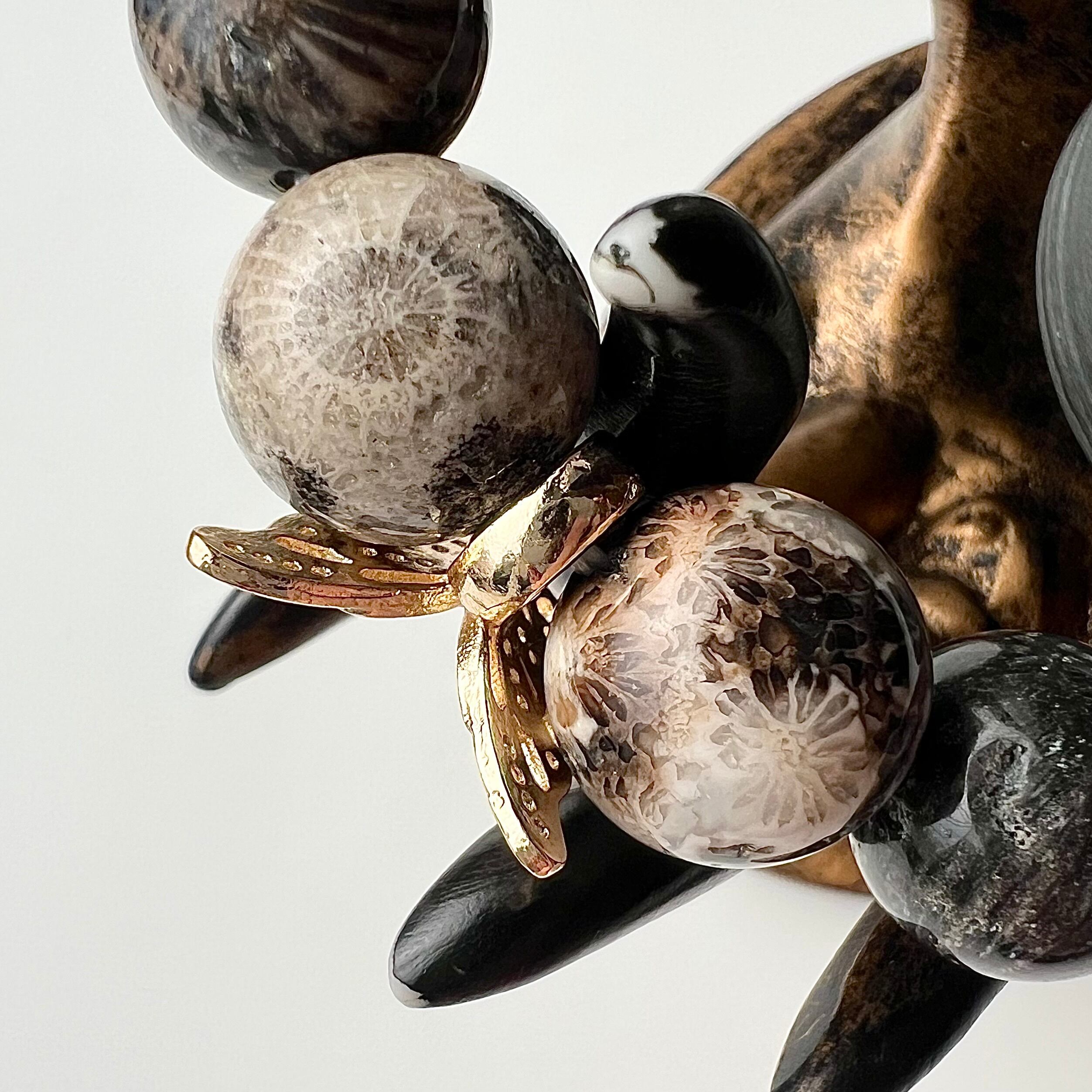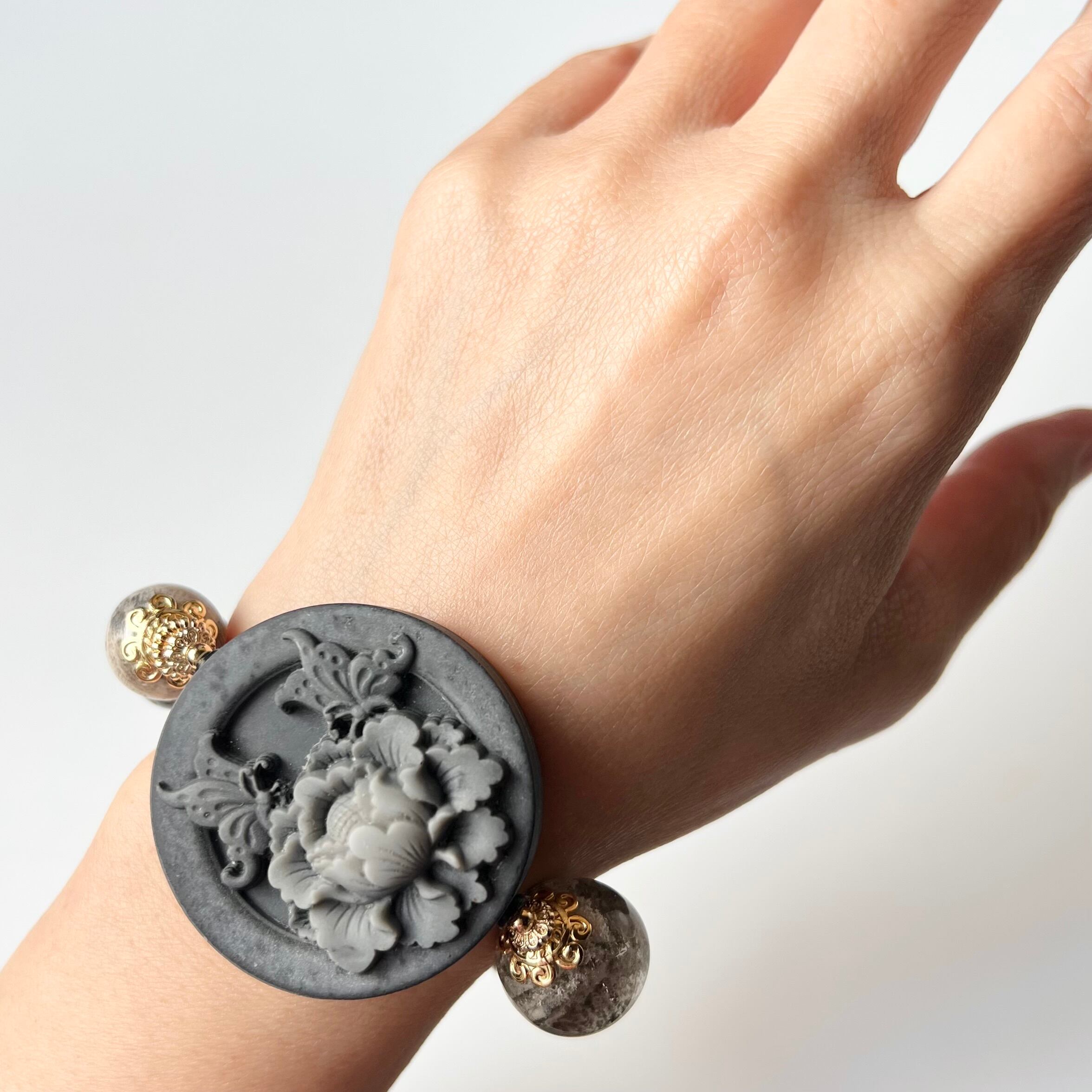華やかな彫刻が施された太極石とフォッシルコーラルのデザインブレスレットです