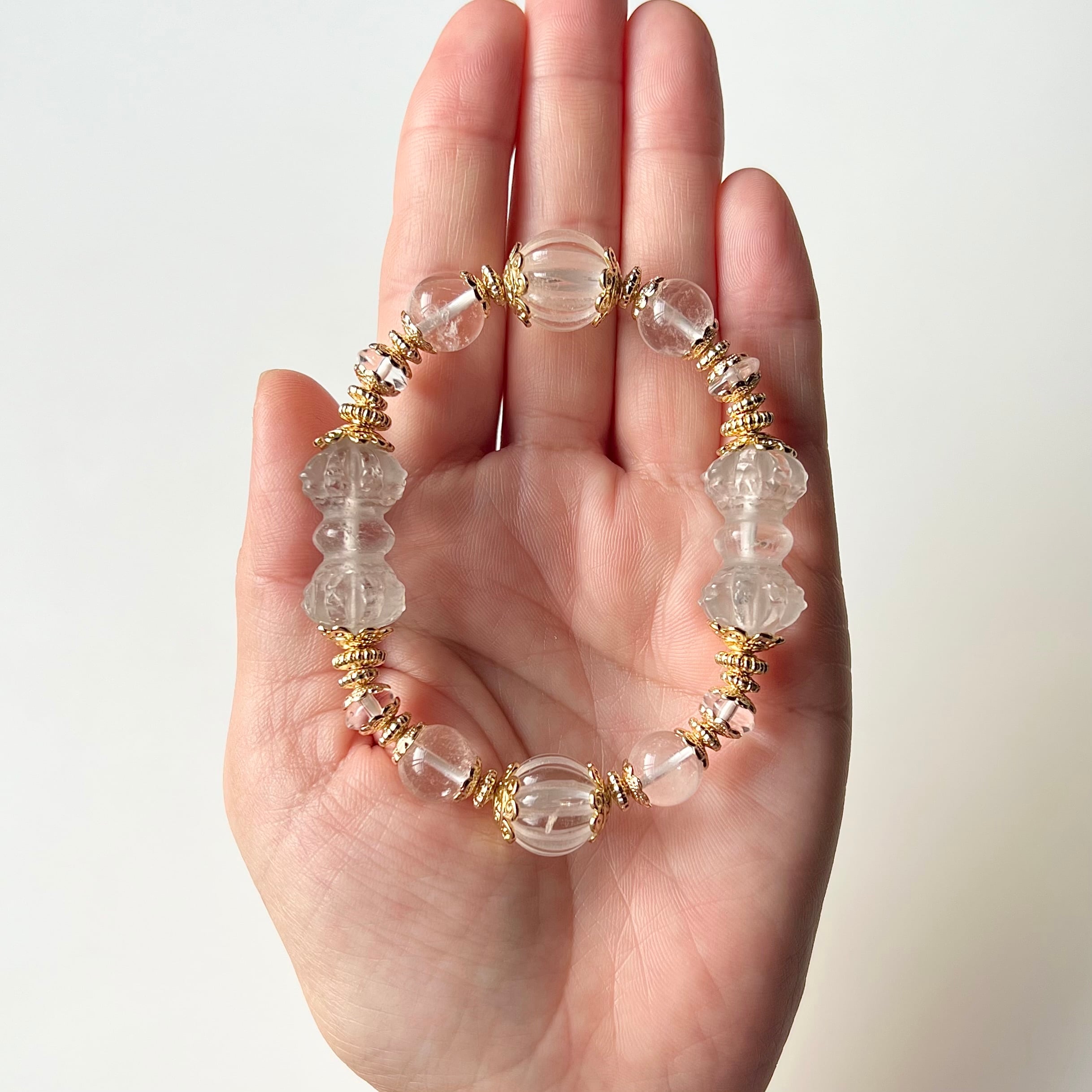 アジア圏の装飾をイメージした、水晶にゴールドパーツが映えるブレスができました