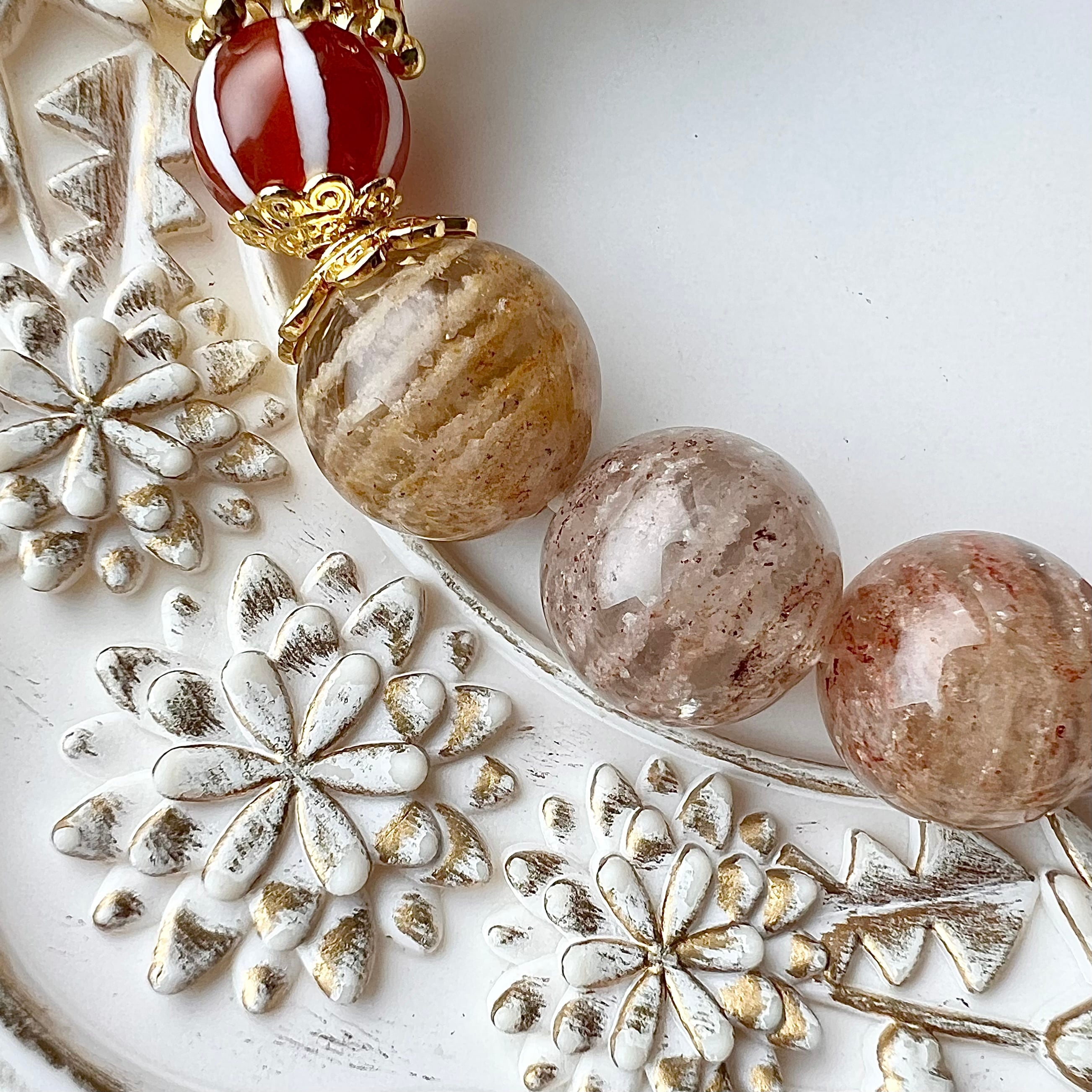 赤×白を基調に、ガーデンクォーツの縞々を宇宙で浮かぶ惑星に見立てたブレスができました