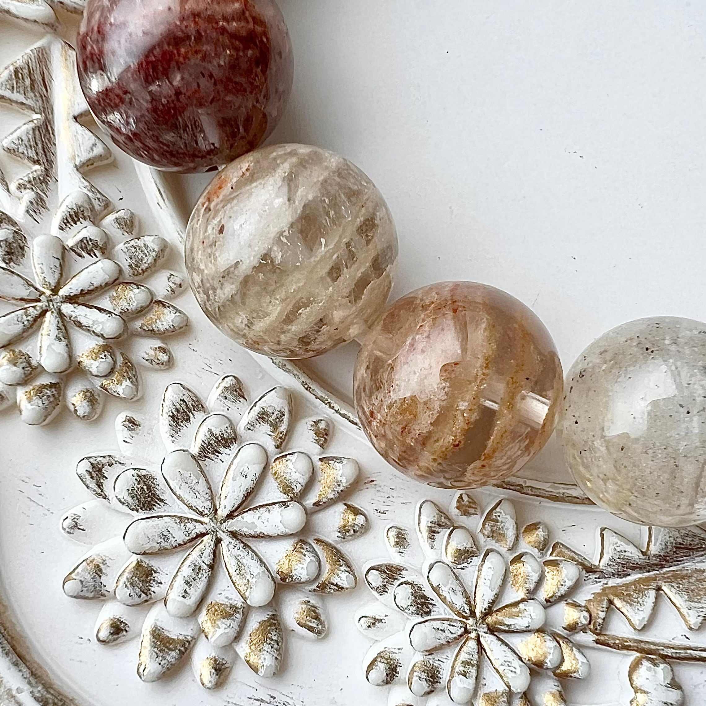そのホワイトガーデンクォーツの下にはアラシャン瑪瑙の惑星彫刻を置きました