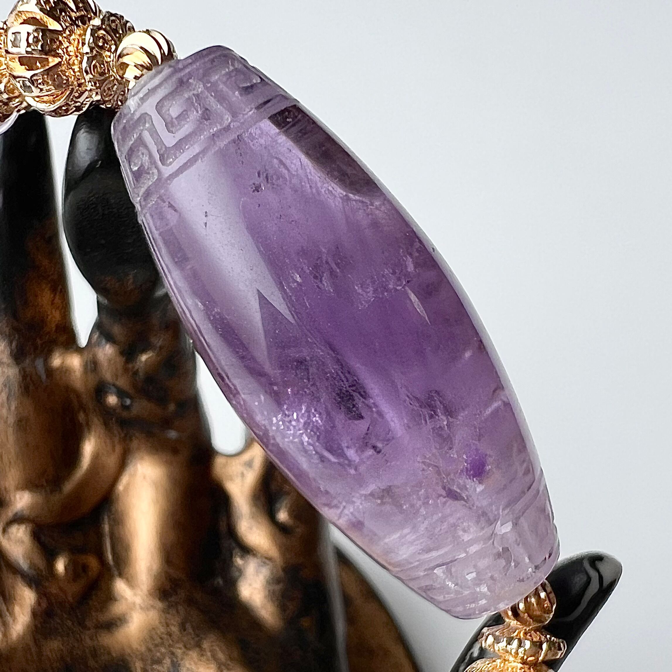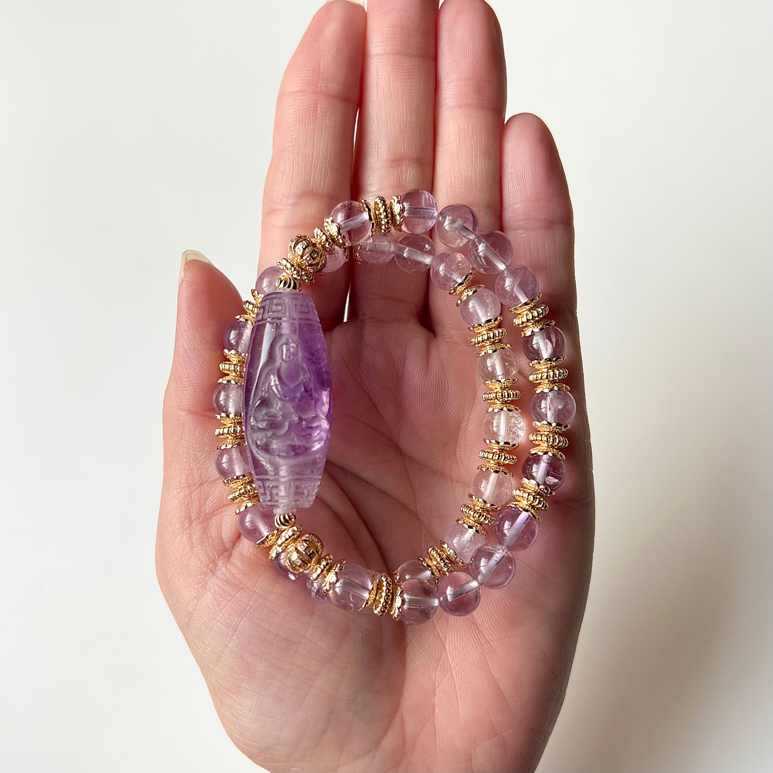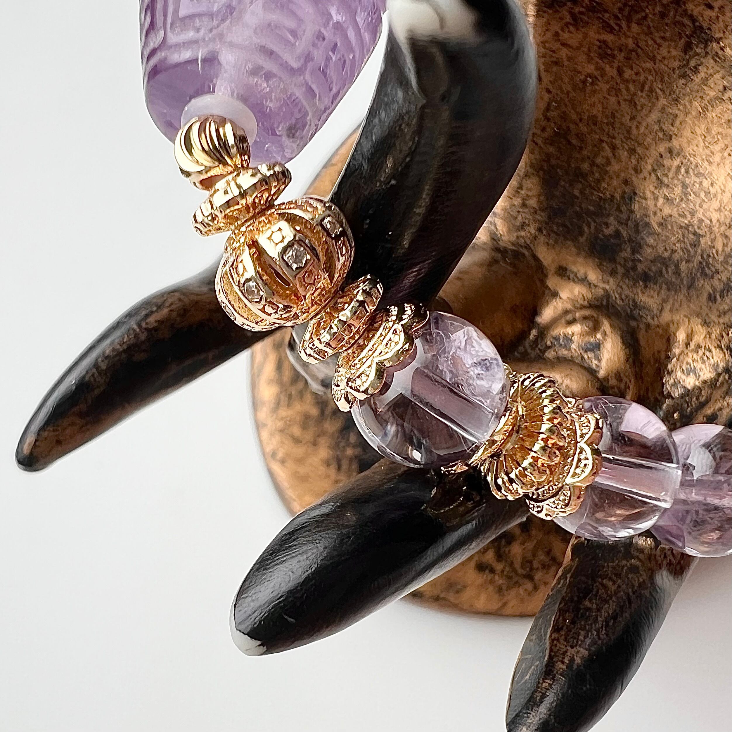 仏様の彫刻が施された天珠型アメジストとラベンダーアメジストのデザインブレスレットです