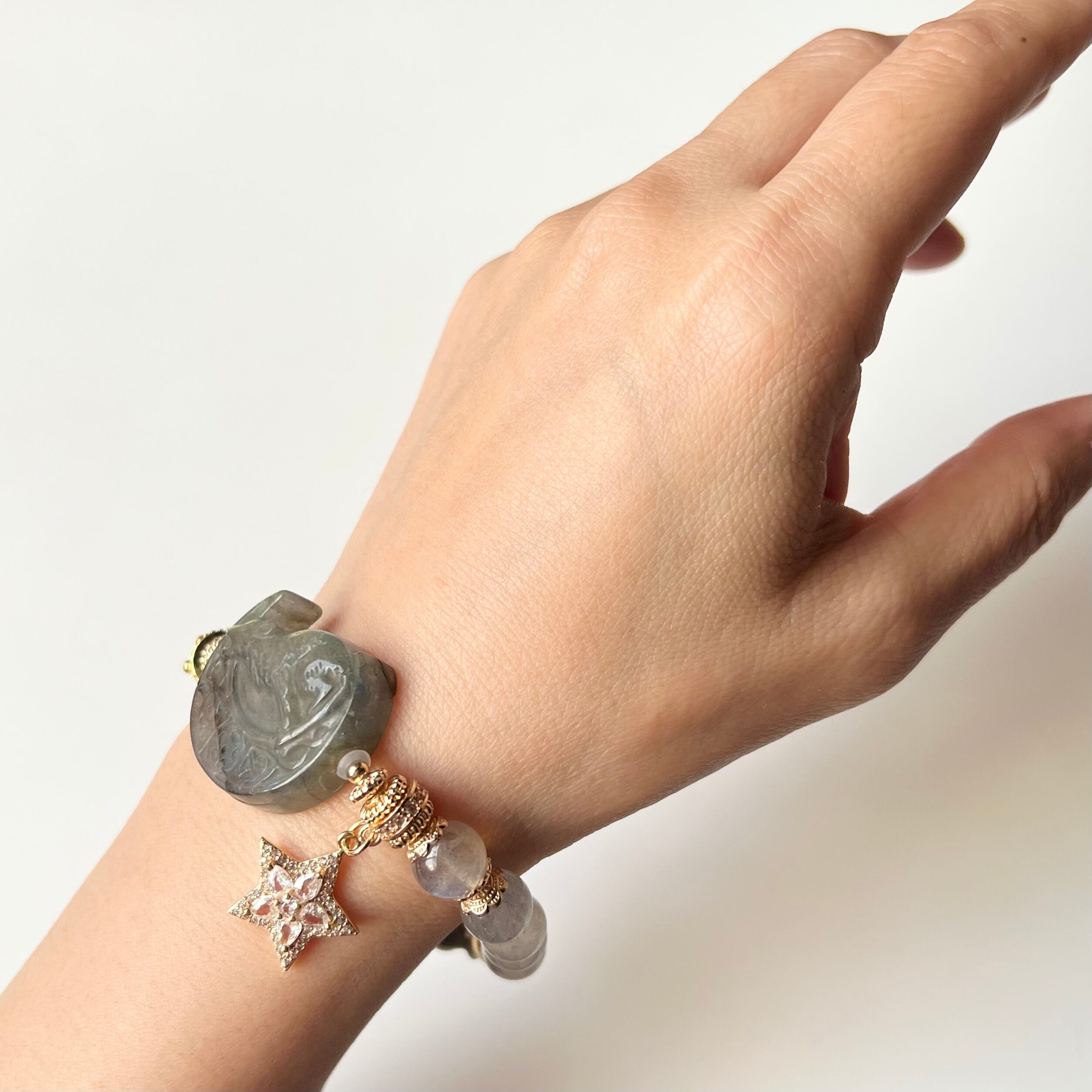 三日月と狼、小鳥のラブラドライトデザインブレスレットです