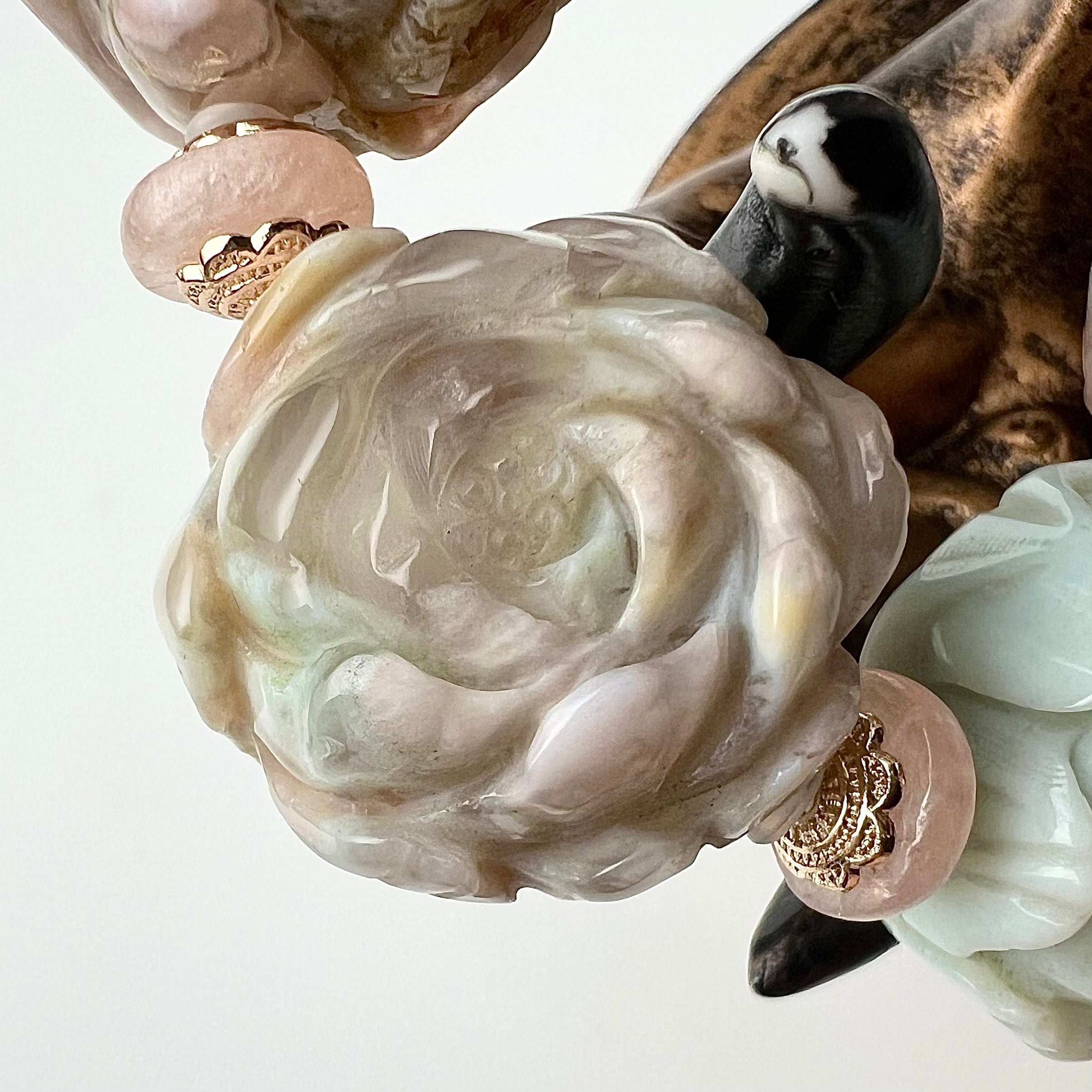 桜瑪瑙を数多く扱っている石屋さんにあった花彫りの中から、人気があるグリーン桜瑪瑙の特に可愛かった花彫りを選んだつもりです