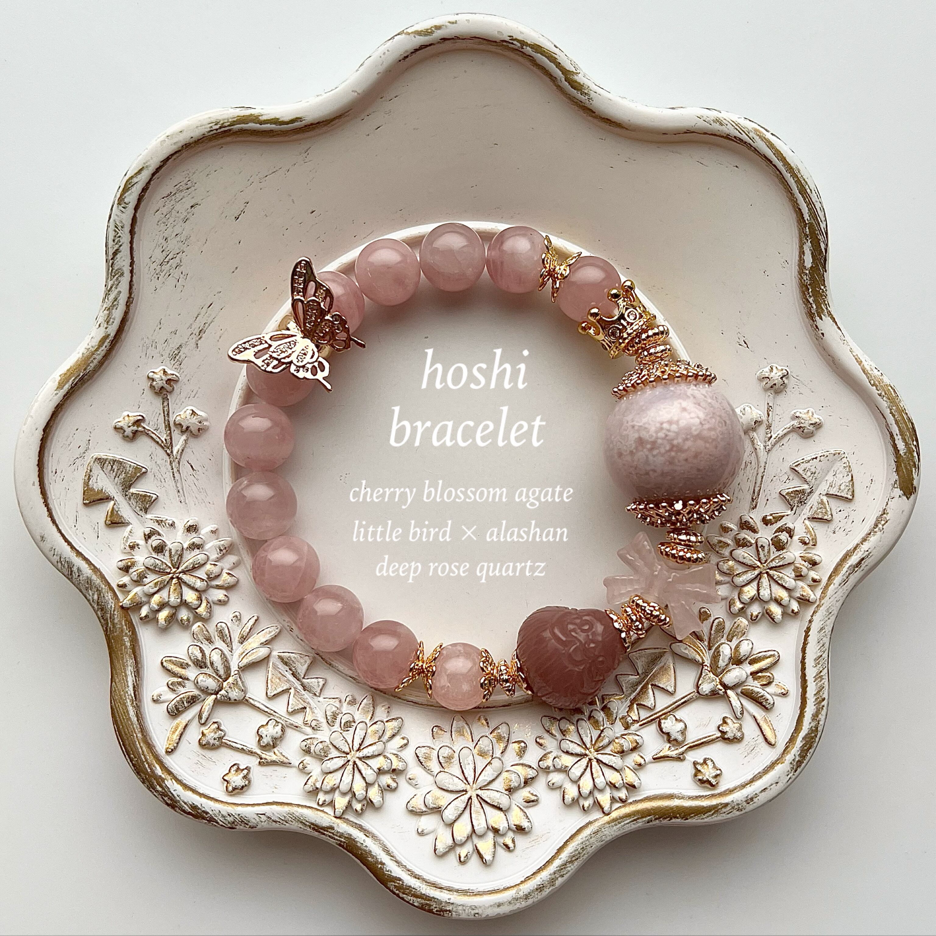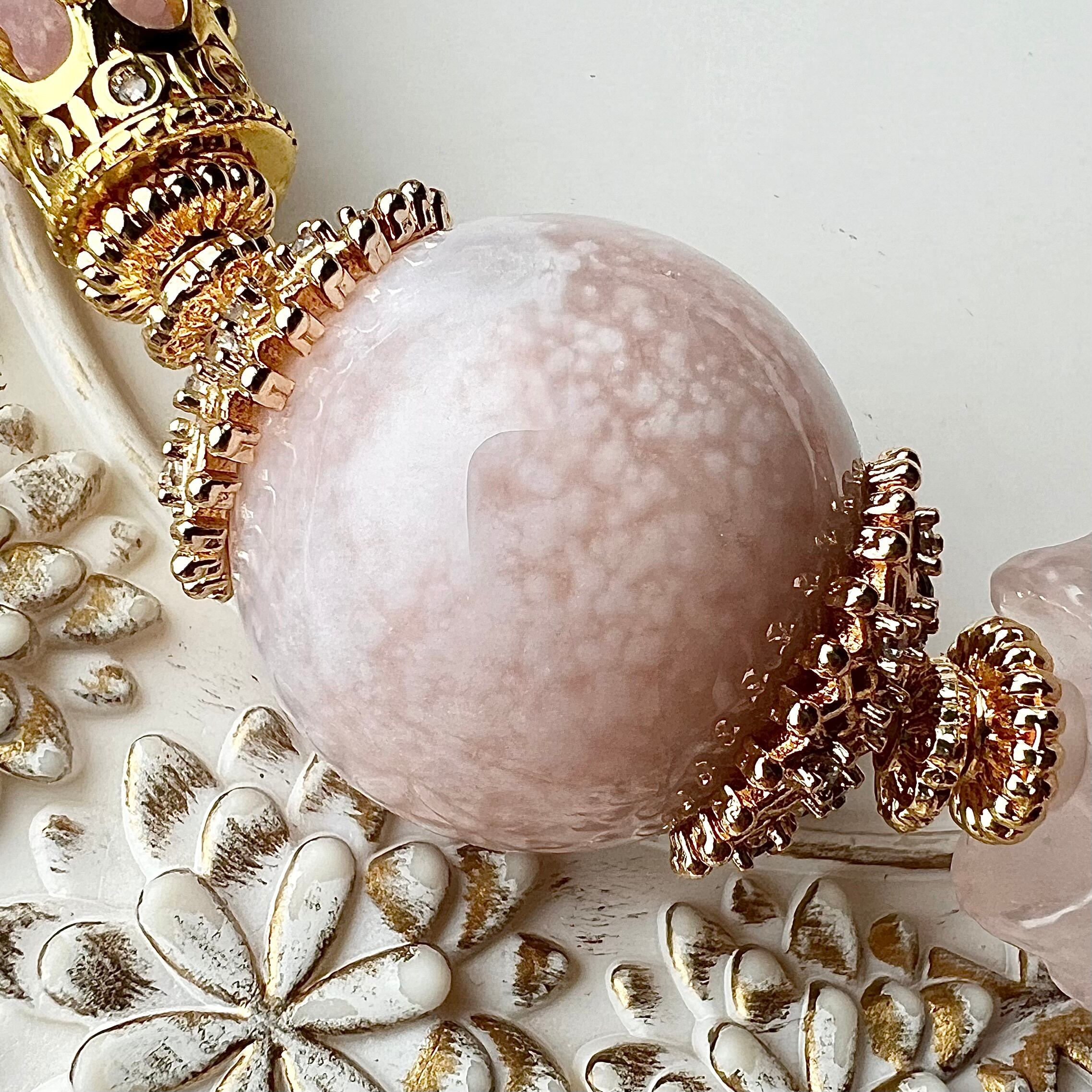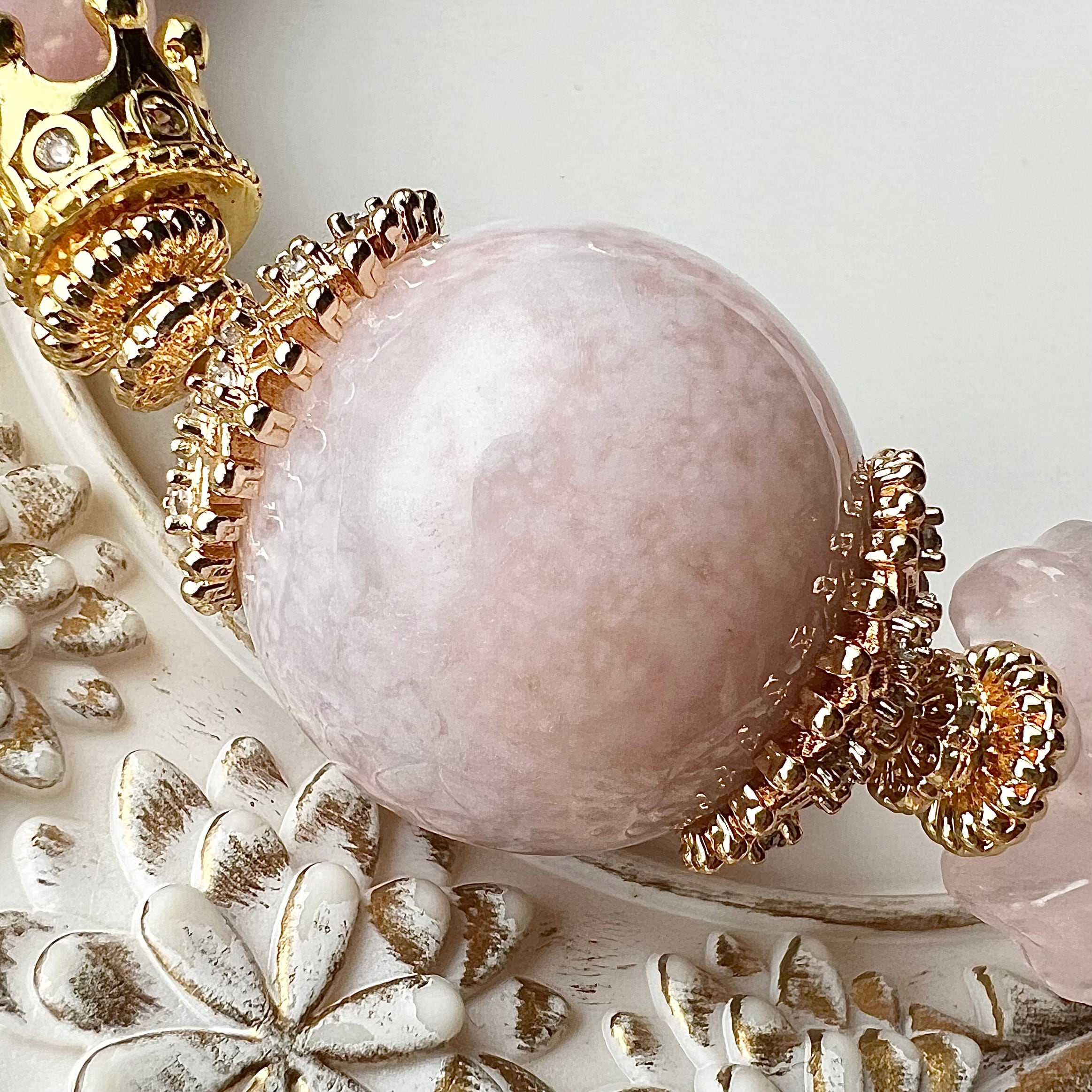 他にもローズクォーツのリボンや王冠などのゴールドパーツを添えて華やかに仕上げました