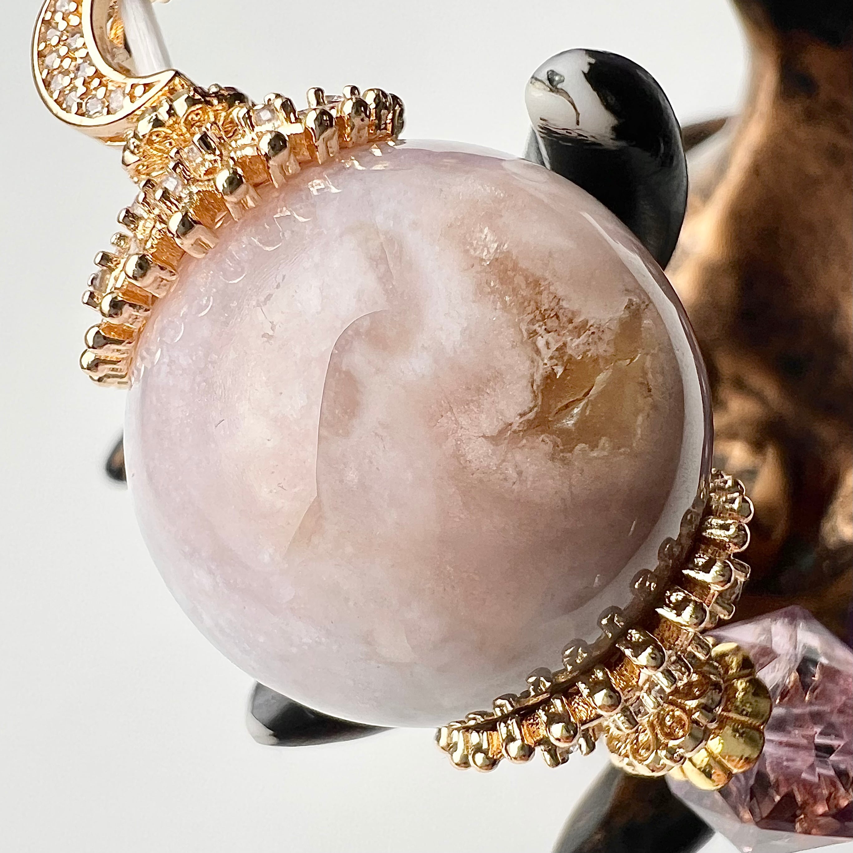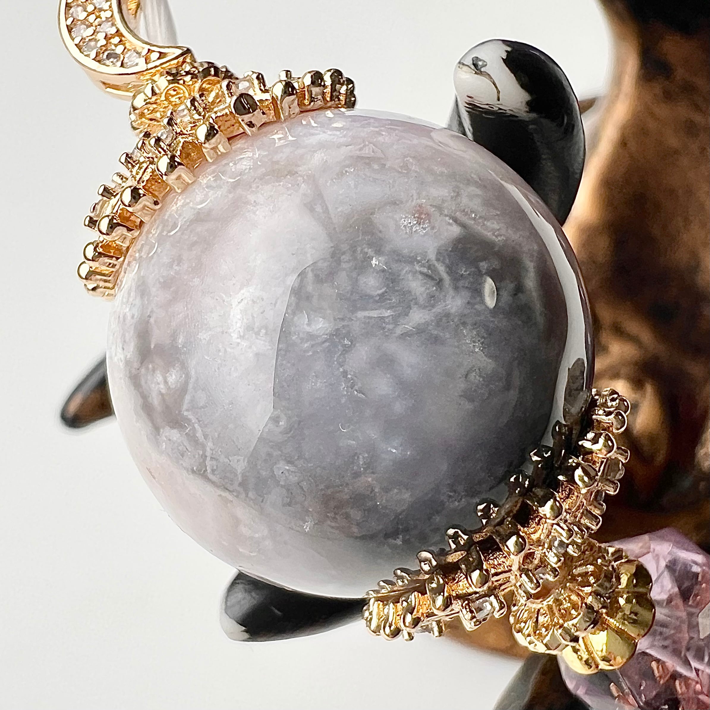 3番は満開の桜に似た小さな内包物がパープルグレーの瑪瑙の中にギッシリ詰まっており、見上げた桜の隙間から見える夜空を思わせます