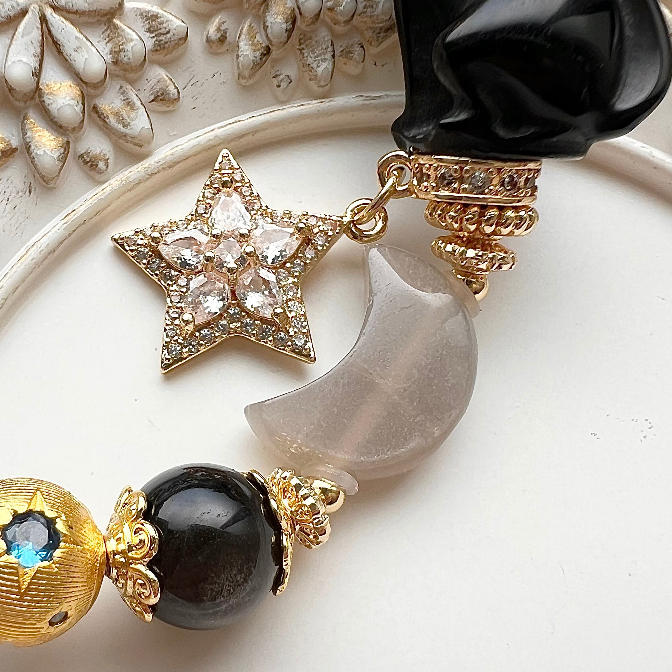 黒猫の下にはシルバームーンストーンの三日月と星のチャームを一つずつあしらいました