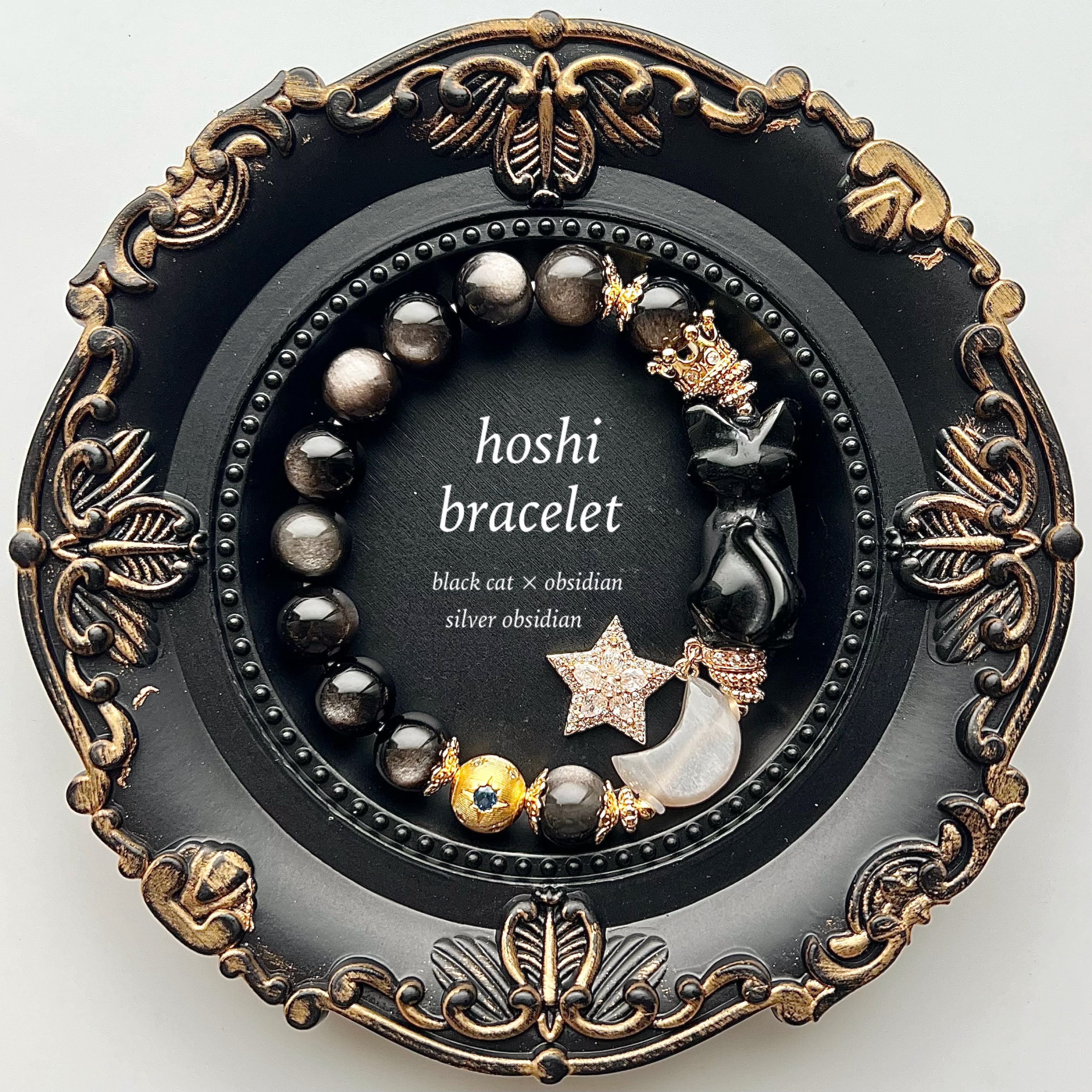 オブシディアン 黒猫 シルバームーンストーン 三日月 天然石 ブレスレット