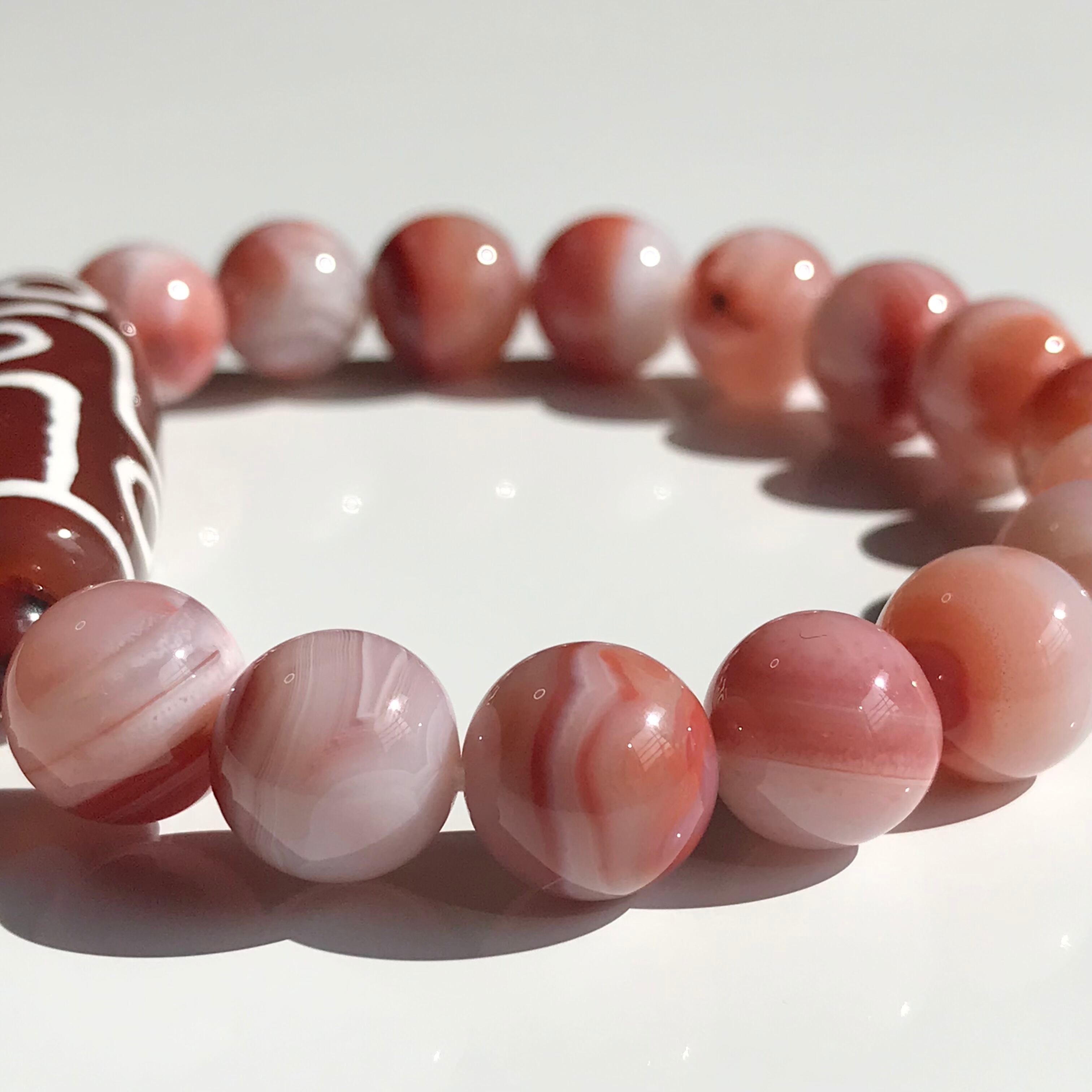 一粒一粒個性的な縞模様が可愛いらしいアプリコットアゲートと、赤瑪瑙の九眼天珠のブレスレットです