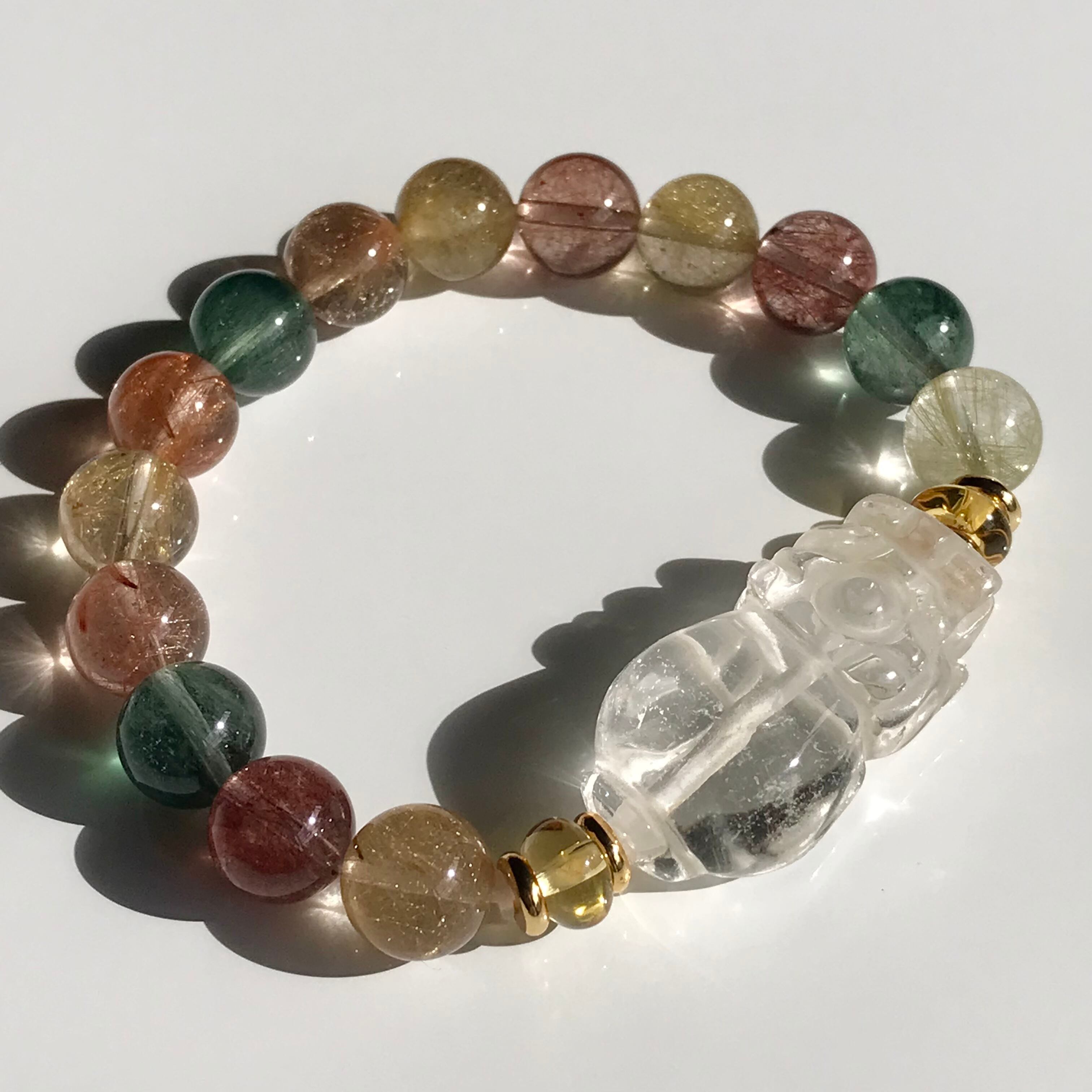 水晶の貔貅とミックスルチルのブレスです、小ぶりですが透明感があり品質の良いミックスルチルです