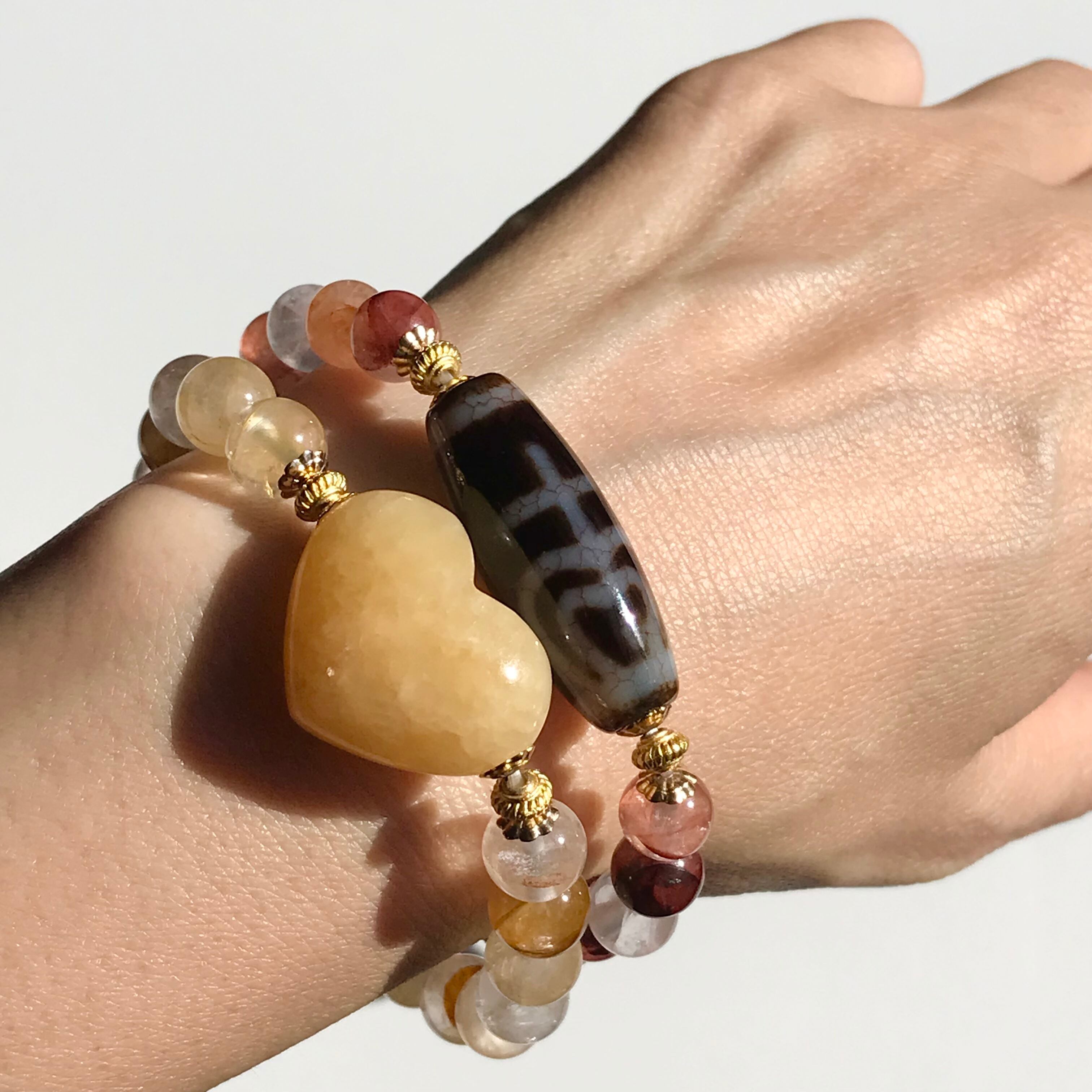 至純宝瓶天珠×赤マニカラン、ハート型イエローカルサイト×イエローマニカランの2本セットです