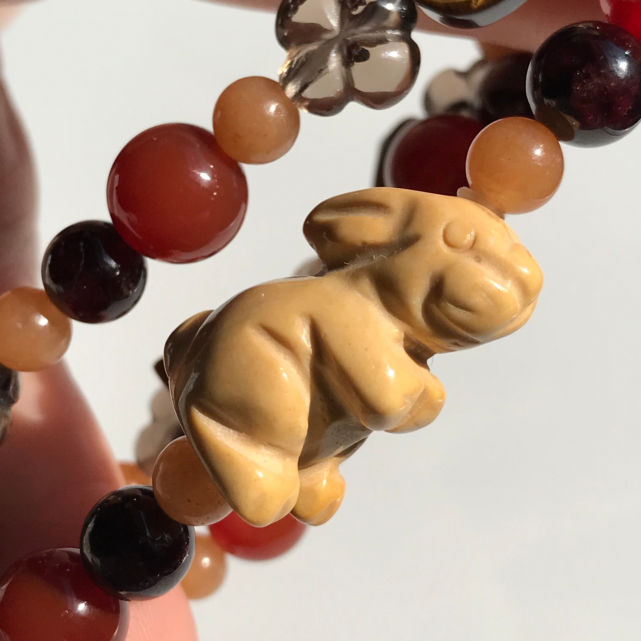うさぎジャスパー 鳥タイガーアイ 四葉スモーキークォーツ 彫刻 天然石 ブレスレット