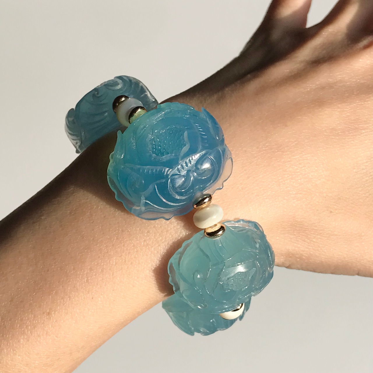 アクアマリン 牡丹彫刻 天然石 ブレスレット
