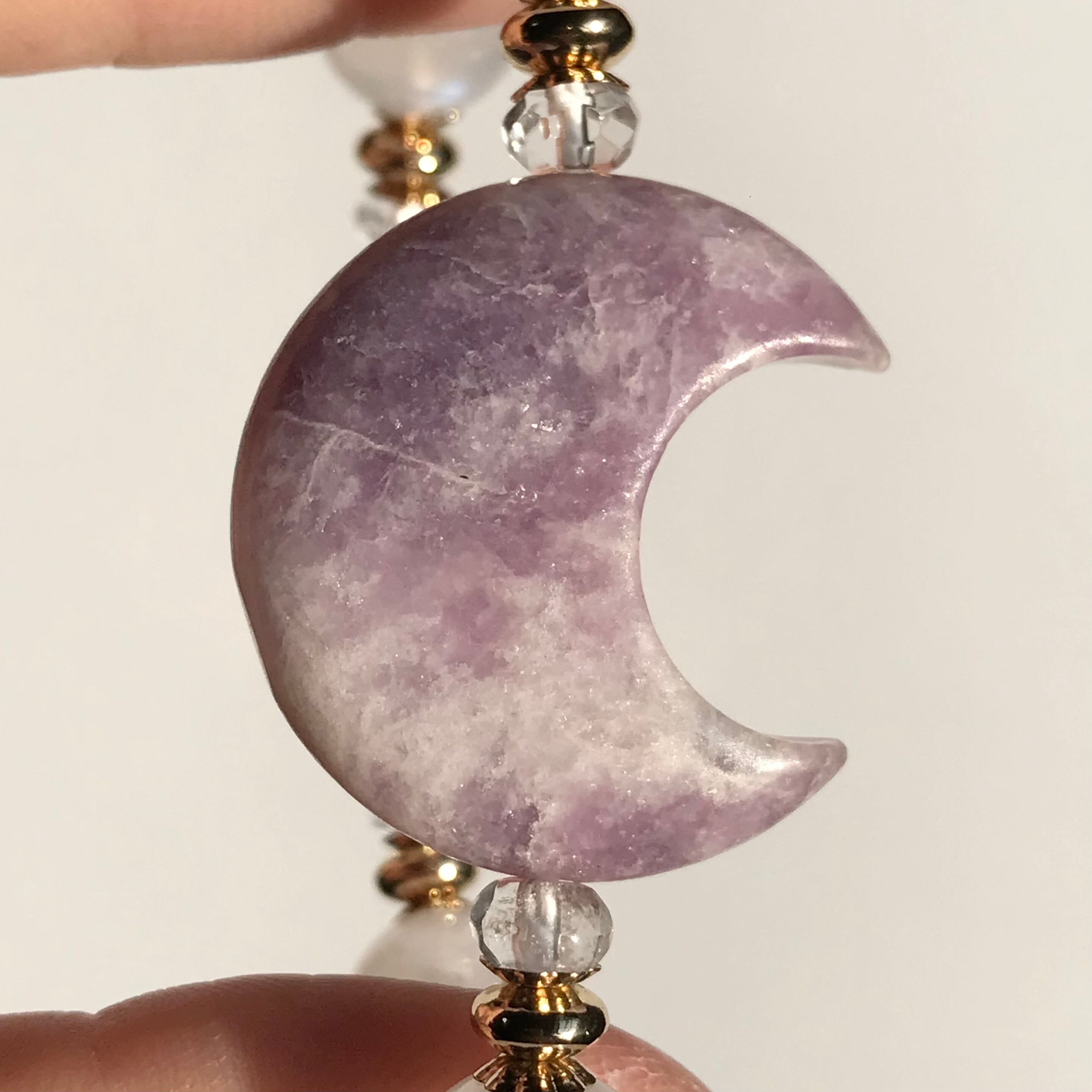 アメジストの三日月とムーンストーン、水晶蓮花彫刻を組み合わせたブレスです