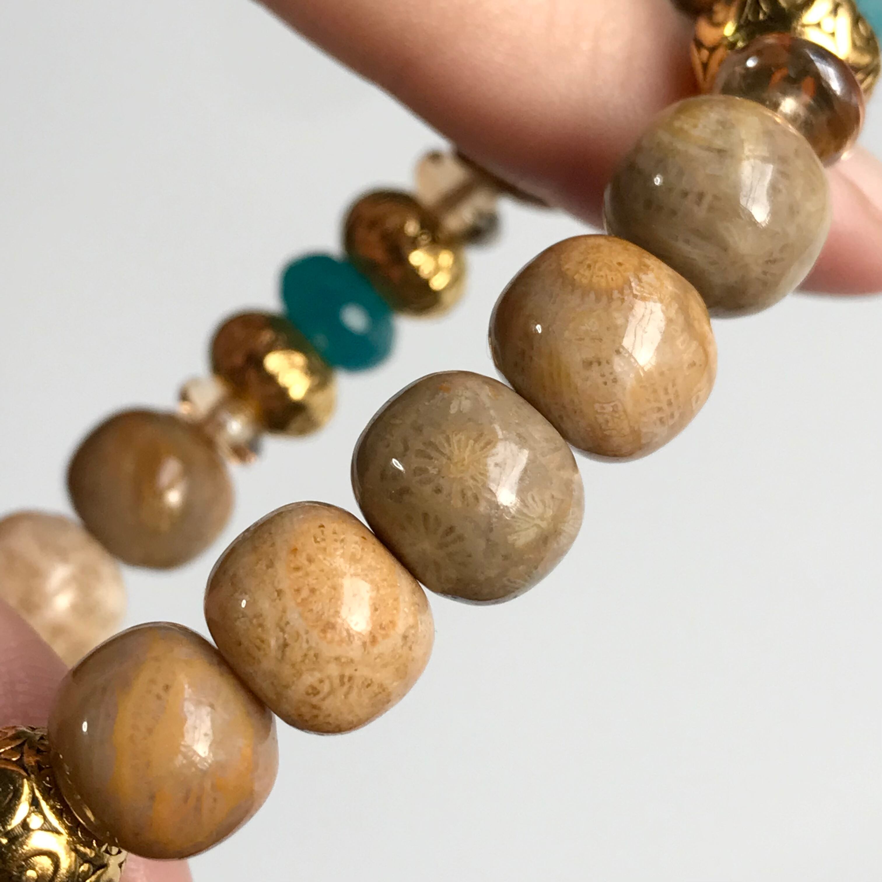 キャラメルみたいに美味しそうなアラシャン瑪瑙のガネーシャとフォッシルコーラルのブレスです