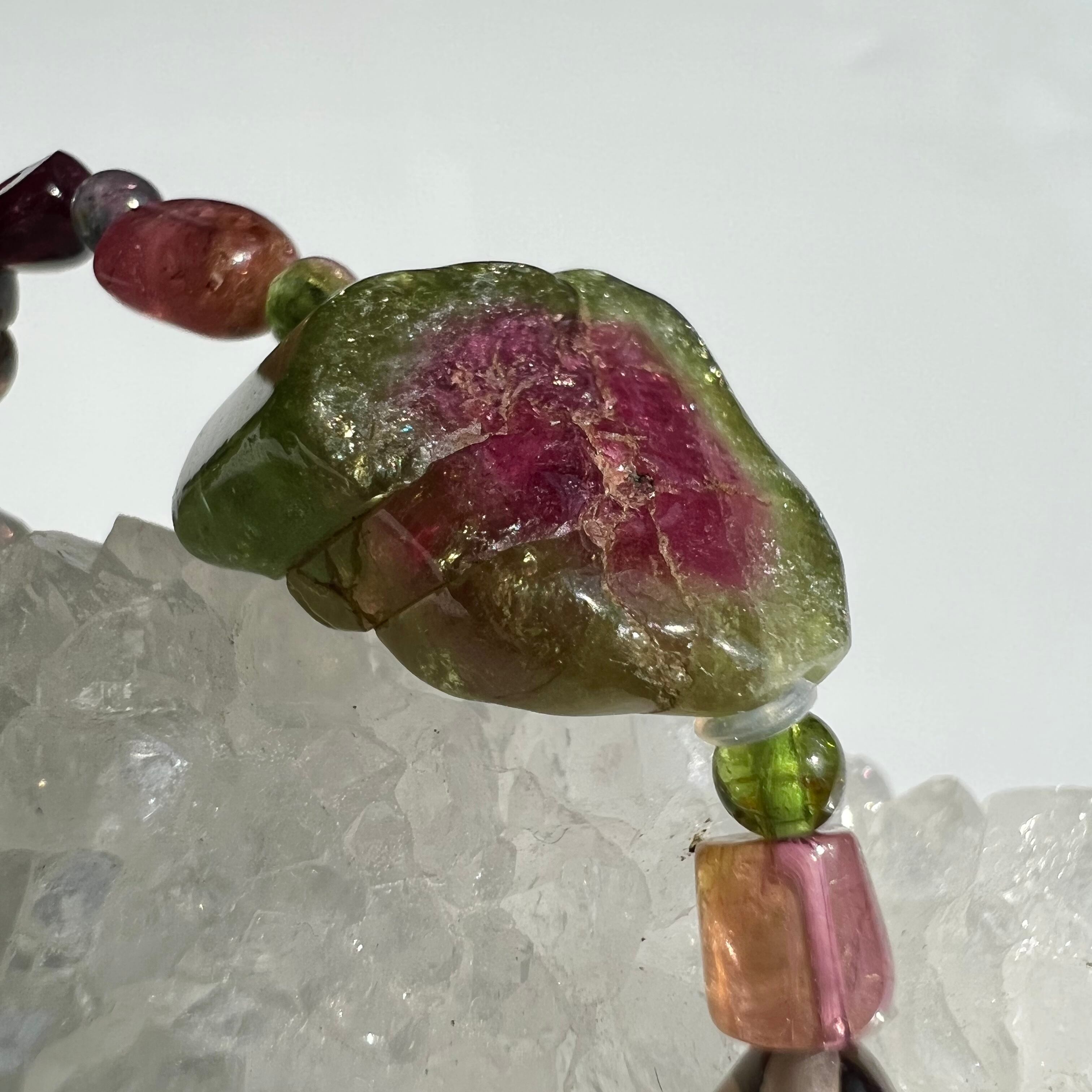 ウォーターメロントルマリンのラフカットをメインに、極細身のキャンディーカラートルマリンと組んででブレスにしました
