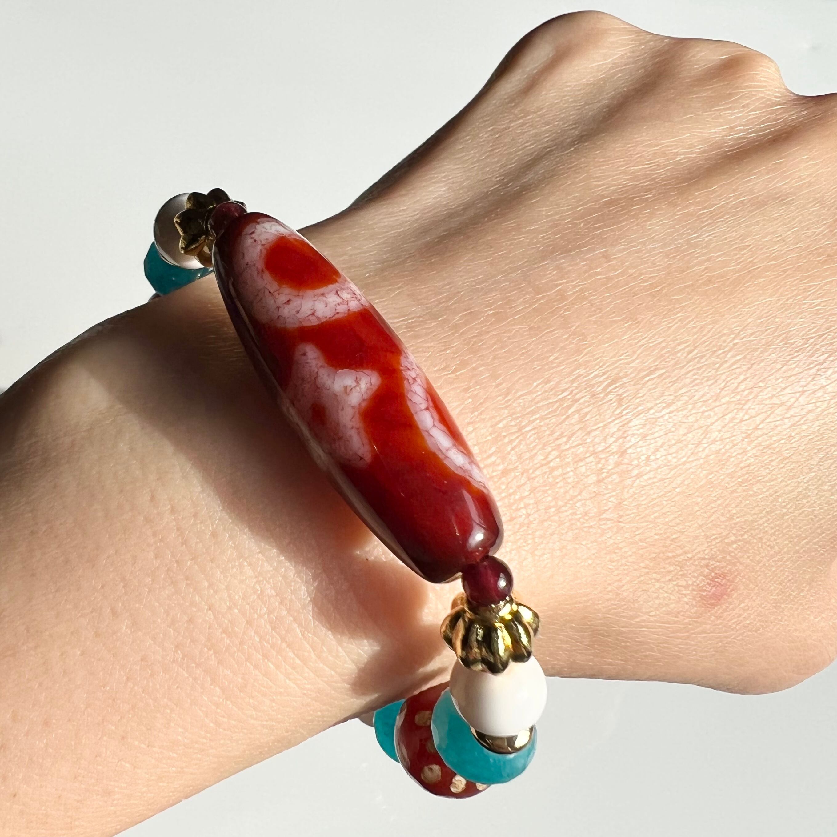 日月星天珠をメインに赤、青、白とポップなカラーリングのブレスにしました