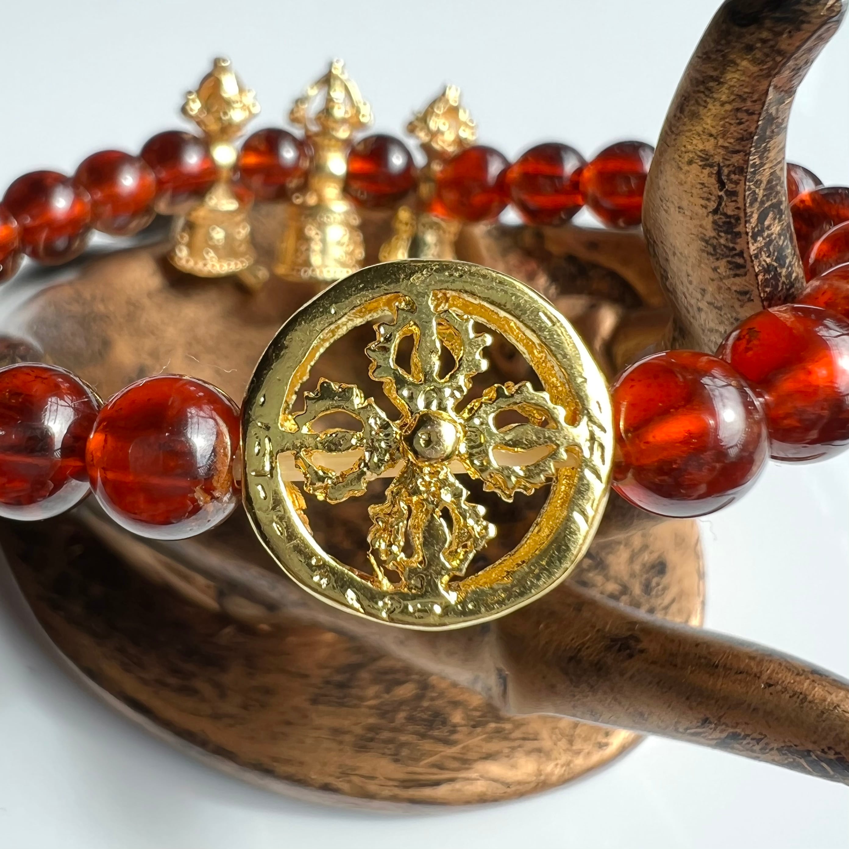金剛鈴(チベタンベル)と金剛杵(バジュラ)を模したゴールドパーツとオレンジガーネット(ヘソナイト)のブレスです