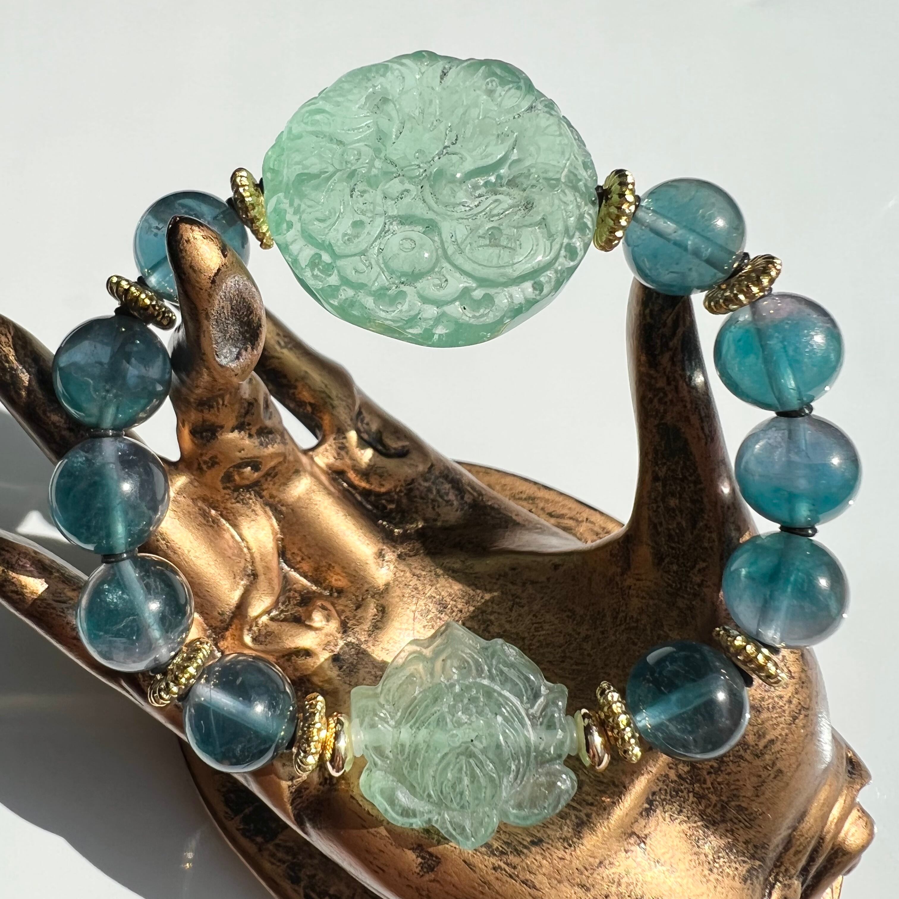 フローライト 龍彫り 蓮花彫刻 天然石 ブレスレット
