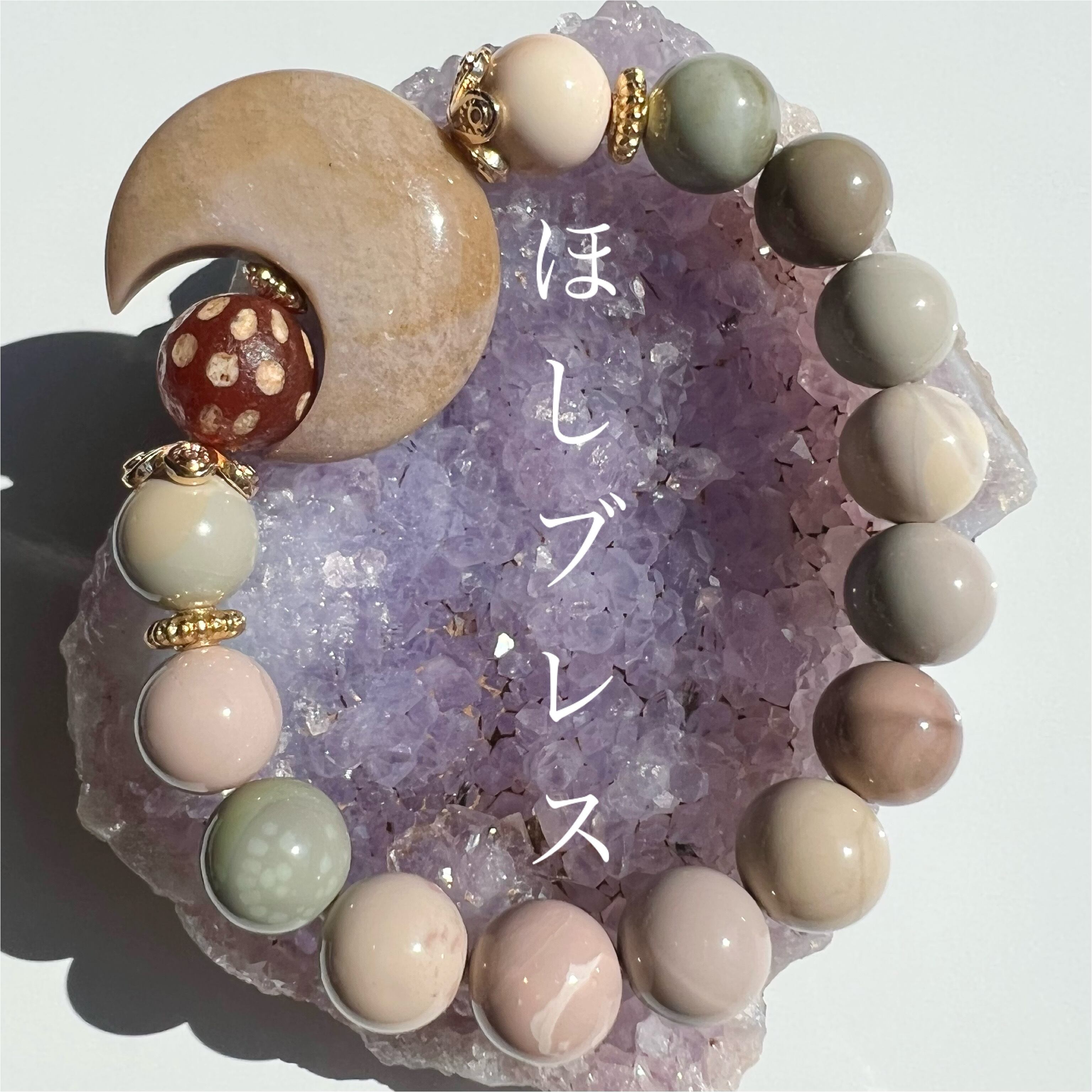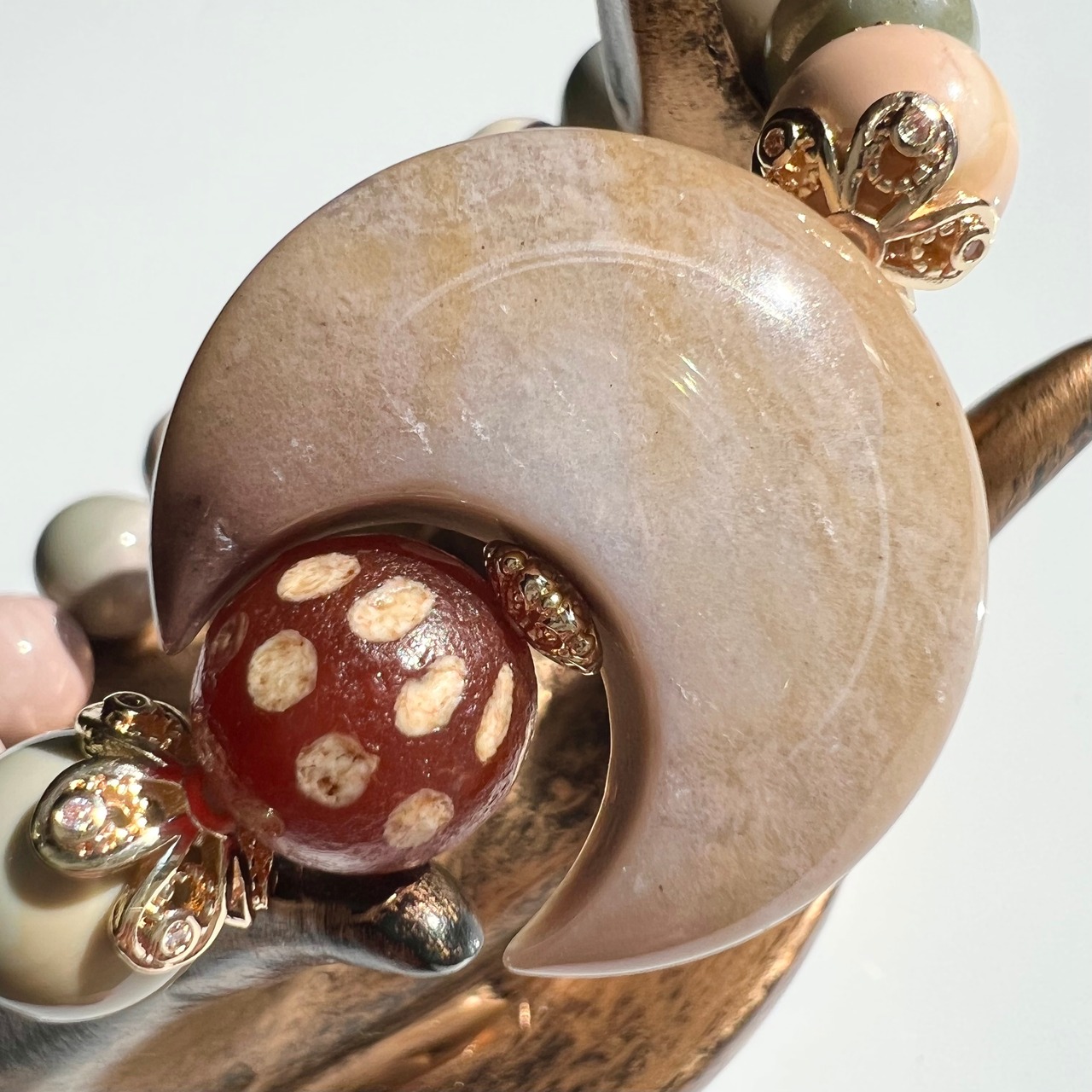 くすんだパステルカラーが可愛いアラシャン瑪瑙の三日月と丸玉のブレスに、星空と三日月をイメージし赤い満天天珠をあしらいました