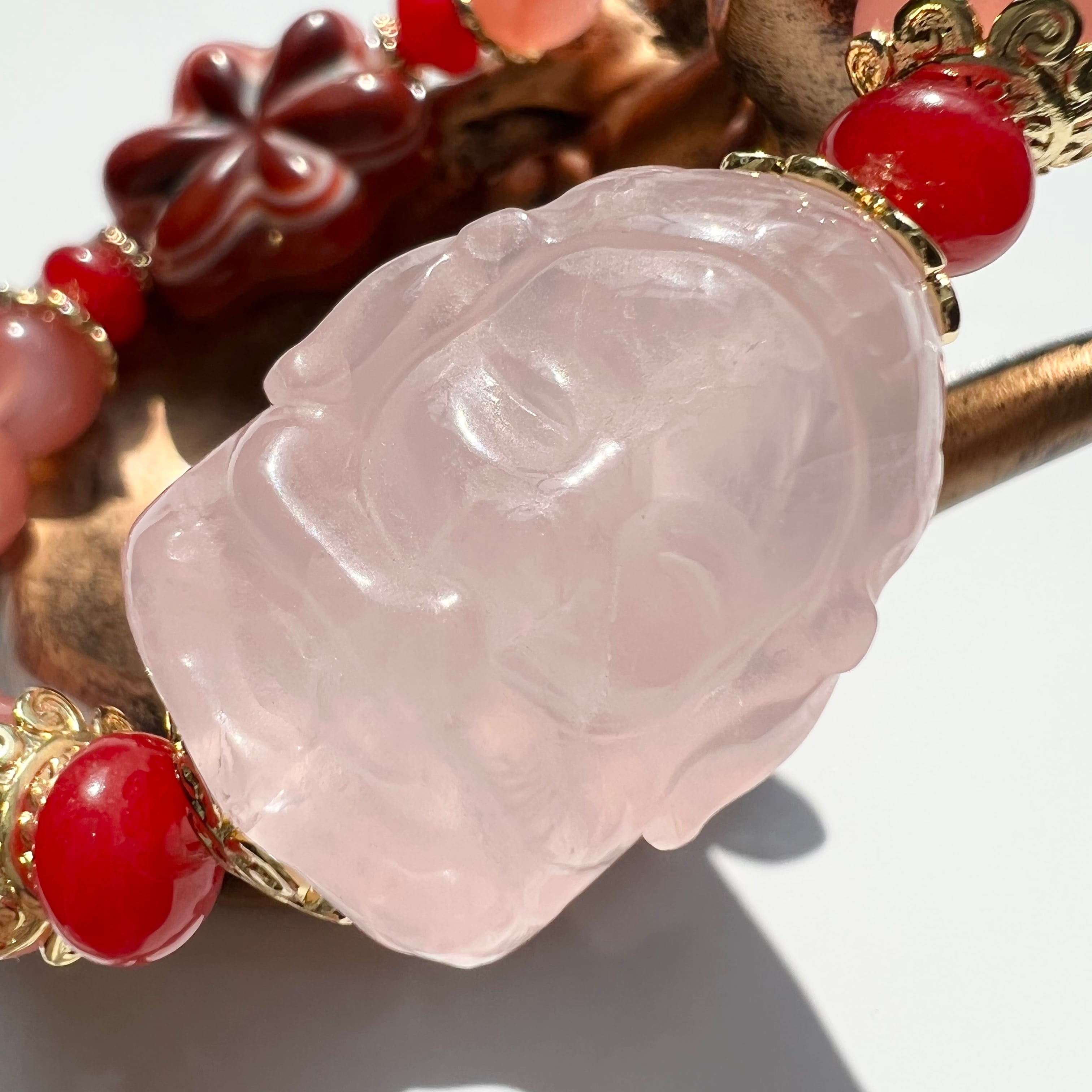ローズクォーツ ガネーシャ 塩源瑪瑙 蓮花羊眼板天珠 天然石 ブレスレット