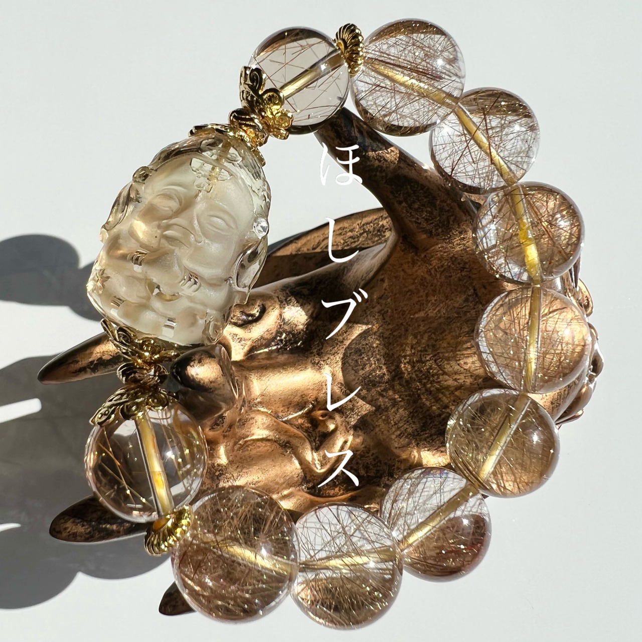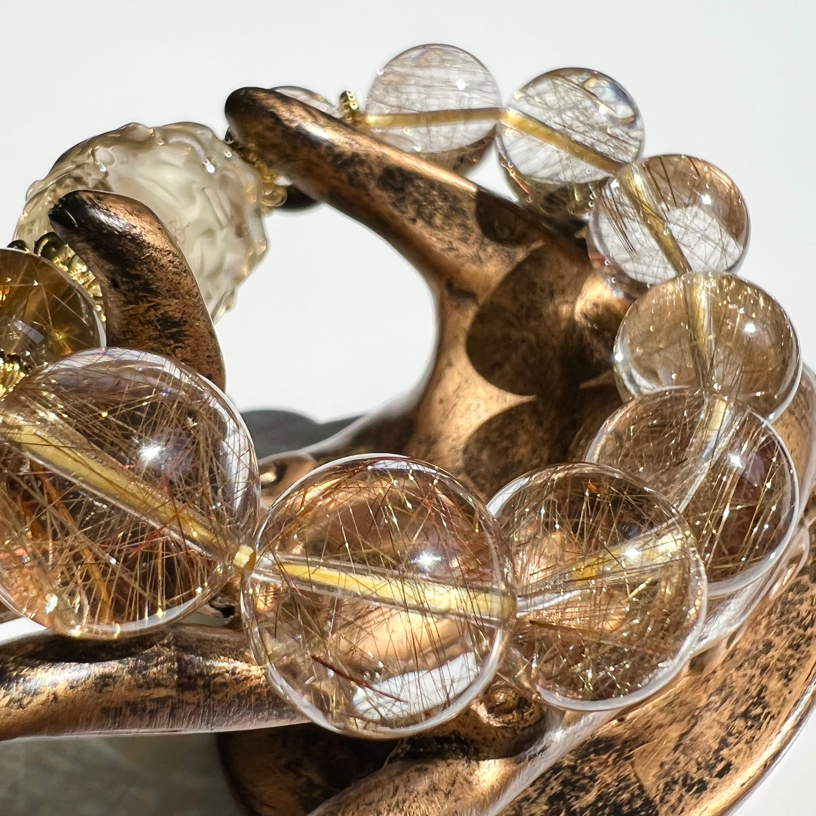 細かな彫刻が施されたスモーキーシトリンのガネーシャと、大玉高品質ルチルクォーツの贅沢なブレスです