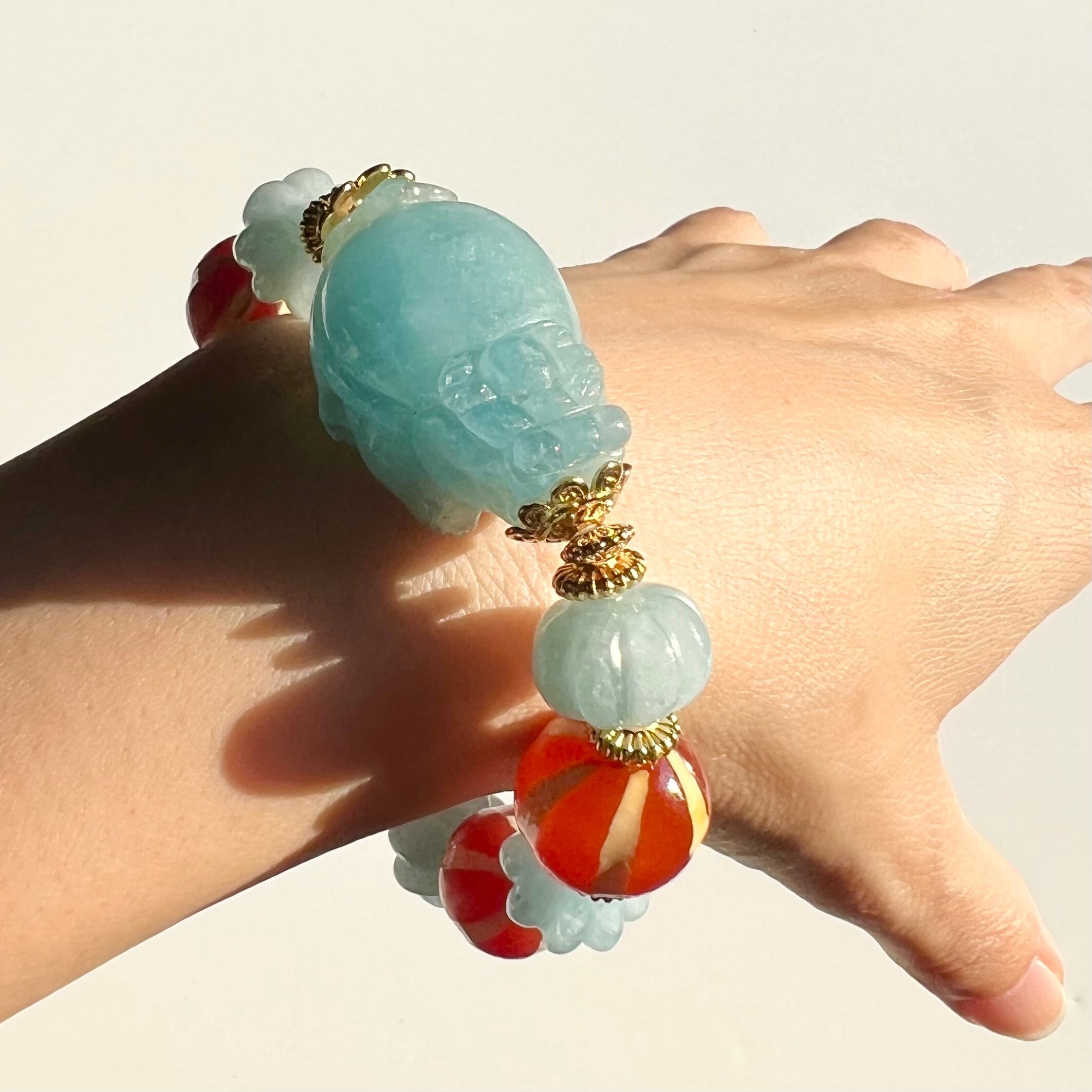 ボリュームのあるアクアマリンの龍亀と、どこかレトロでポップな雰囲気のある赤い南瓜珠を合わせたブレスです