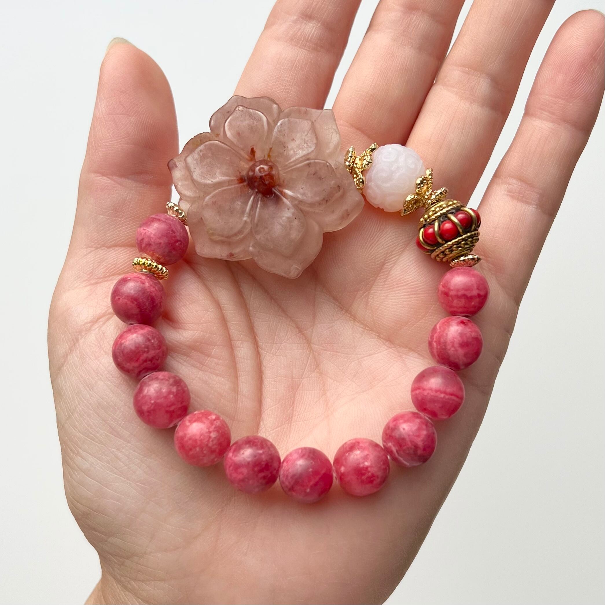 ライモナイト 花 彫刻 塩源瑪瑙 インカローズ 天然石 ブレスレット