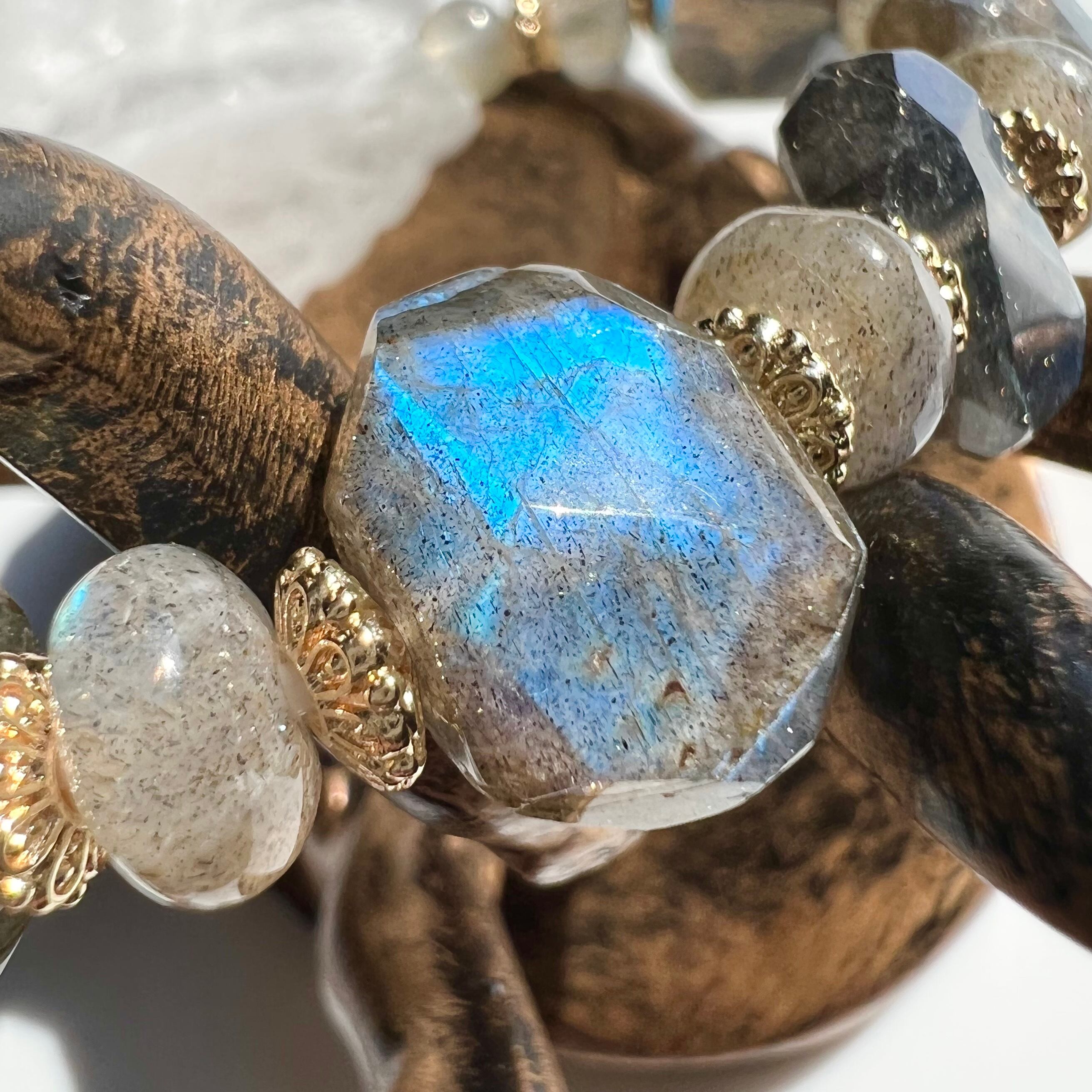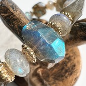 水晶の蓮花彫刻とラブラドライトカットのブレスです、蓮花とブルーシラーの組み合わせが幻想的でとても綺麗です