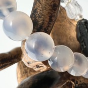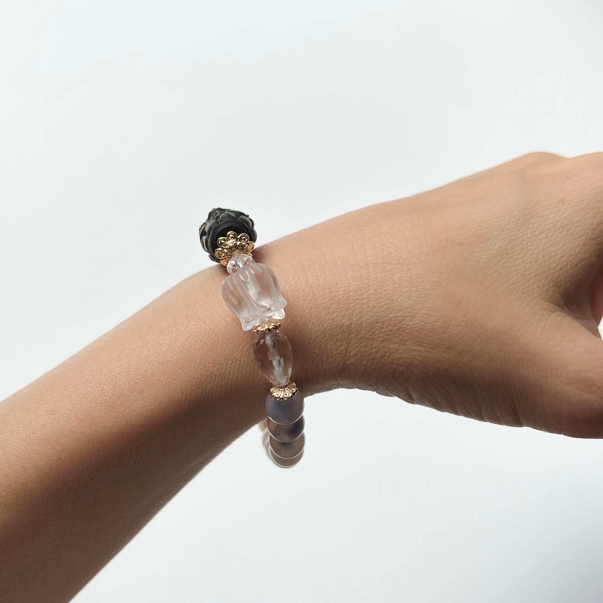 瑪瑙に施されたガネーシャ彫刻とタピオカアゲートのブレスです、瑞々しい感じの装飾を加えたかったので水晶のすずらんもあしらいました